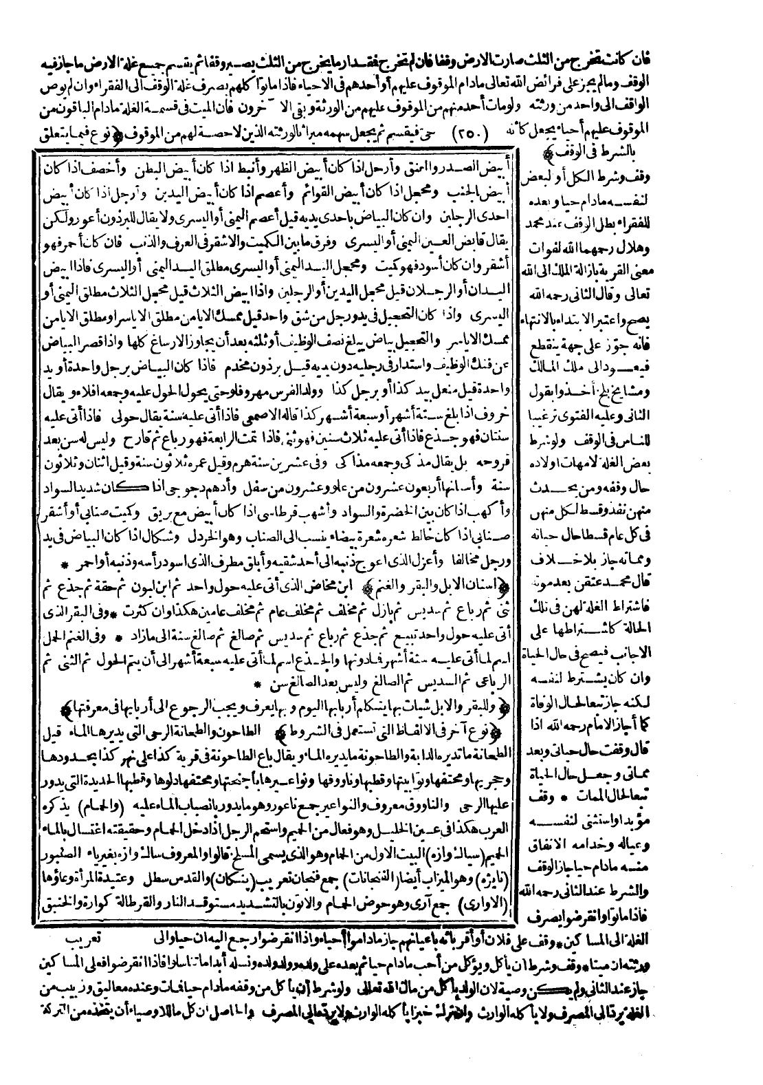 (نَوْعٌ آخَرُ فِي الْأَلْفَاظِ الَّتِي تُسْتَعْمَلُ فِي الشُّرُوطِ) الطَّاحُونُ وَالطَّاحِنَةُ الرَّحَى الَّتِي يُدِيرُهَا الْمَاءُ قِيلَ الطَّاحِنَةُ مَا تُدِيرُهُ الدَّابَّةُ وَالطَّاحُونَةُ مَا يُدِيرُهُ الْمَاءُ وَيُقَالُ بَاعَ الطَّاحُونَةَ فِي قَرْيَةِ كَذَا عَلَى نَهْرِ كَذَا بِحُدُودِهَا وَحَجَرَيْهَا وَمُحْتَفِّهَا وَتَوَابِيتِهَا وَقُطْبِهَا وَنَاوُوقِهَا وَنَوَاعِيرِهَا بِأَجْنِحَتِهَا وَمُحْتَفُّهَا دَلْوُهَا وَقُطْبُهَا الْحَدِيدَةُ الَّتِي يَدُورُ عَلَيْهَا الرَّحَى وَالنَّاوُوقُ مَعْرُوفٌ وَالنَّوَاعِيرُ جَمْعُ نَاعُورٍ وَهُوَ مَا يَدُورُ بِانْصِبَابِ الْمَاءِ عَلَيْهِ وَالْحَمَّامُ يَذْكُرُهُ الْعَرَبُ هَكَذَا فِي عَيْنِ الْخَلِيلِ وَهُوَ فَعَّالٌ مِنْ الْحَمِيمِ وَاسْتَحَمَّ الرَّجُلُ إذَا دَخَلَ الْحَمَّامَ وَحَقِيقَتُهُ اغْتِسَالٌ بِالْمَاءِ الْحَمِيمِ سِيَّاكَ وازه الْبَيْتُ الْأَوَّلُ مِنْ الْحَمَّامِ وَهُوَ الَّذِي يُسَمَّى السَّلْخُ قَالُوا وَالْمَعْرُوفُ سَاكَ وازه بِغَيْرِ يَاءٍ الصُّنْبُورُ نابزه وَهُوَ الْمِيزَابُ أَيْضًا الْفِنْجَانَاتُ جَمْعُ فِنْجَانٍ تَعْرِيبُ (بَنْكَانِ) وَالْقُدْسُ سَطْلٌ وَعَتِيدَةُ الْمَرْأَةِ وِعَاؤُهَا الْأَوَارِي جَمْعُ آرِيٍّ وَهُوَ حَوْضُ الْحَمَّامِ وَالْآتُّونَ بِالتَّشْدِيدِ مُسْتَوْقَدُ النَّارِ وَالْقِرْطَالَةُ كُوَّارَةٌ وَالْخنْبَقُ