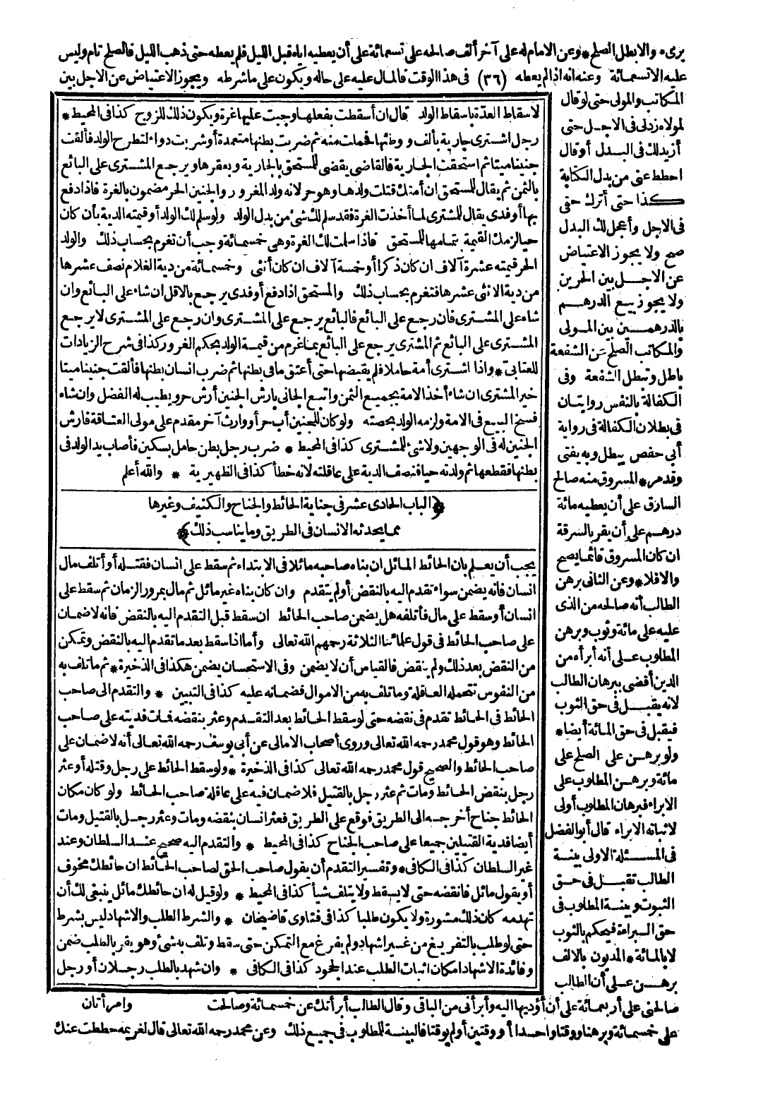 (الْبَابُ الْحَادِيَ عَشَرَ فِي جِنَايَةِ الْحَائِطِ وَالْجَنَاحِ وَالْكَنِيفِ، وَغَيْرِهَا مِمَّا يُحْدِثُهُ الْإِنْسَانُ فِي الطَّرِيقِ، وَمَا يُنَاسِبُ ذَلِكَ) يَجِبُ أَنْ يُعْلَمَ بِأَنَّ الْحَائِطَ الْمَائِلَ إنْ بَنَاهُ صَاحِبُهُ مَائِلًا فِي الِابْتِدَاءِ ثُمَّ سَقَطَ عَلَى إنْسَانٍ فَقَتَلَهُ أَوْ أَتْلَفَ مَالَ إنْسَانٍ فَإِنَّهُ يَضْمَنُ سَوَاءٌ تَقَدَّمَ إلَيْهِ بِالنَّقْضِ، أَوْ لَمْ يَتَقَدَّمْ، وَإِنْ كَانَ بَنَاهُ غَيْرَ مَائِلٍ ثُمَّ مَالَ بِمُرُورِ الزَّمَانِ ثُمَّ سَقَطَ عَلَى إنْسَانٍ، أَوْ سَقَطَ عَلَى مَالٍ فَأَتْلَفَهُ هَلْ يَضْمَنُ صَاحِبُ الْحَائِطِ؟ إنْ سَقَطَ قَبْلَ التَّقَدُّمِ إلَيْهِ بِالنَّقْضِ فَإِنَّهُ لَا ضَمَانَ عَلَى صَاحِبِ الْحَائِطِ فِي قَوْلِ عُلَمَائِنَا الثَّلَاثَةِ - رَحِمَهُمْ اللَّهُ تَعَالَى - وَأَمَّا إذَا سَقَطَ بَعْدَ مَا تَقَدَّمَ إلَيْهِ بِالنَّقْضِ، وَتَمَكَّنَ مِنْ النَّقْضِ بَعْدَ ذَلِكَ، وَلَمْ يَنْقُضْ فَالْقِيَاسُ أَنْ لَا يَضْمَنَ، وَفِي الِاسْتِحْسَانِ يَضْمَنُ هَكَذَا فِي الذَّخِيرَةِ ثُمَّ مَا تَلِفَ بِهِ مِنْ النُّفُوسِ تَتَحَمَّلُهُ الْعَاقِلَةُ، وَمَا تَلِفَ بِهِ مِنْ الْأَمْوَالِ فَضَمَانُهُ عَلَيْهِ كَذَا فِي التَّبْيِينِ.