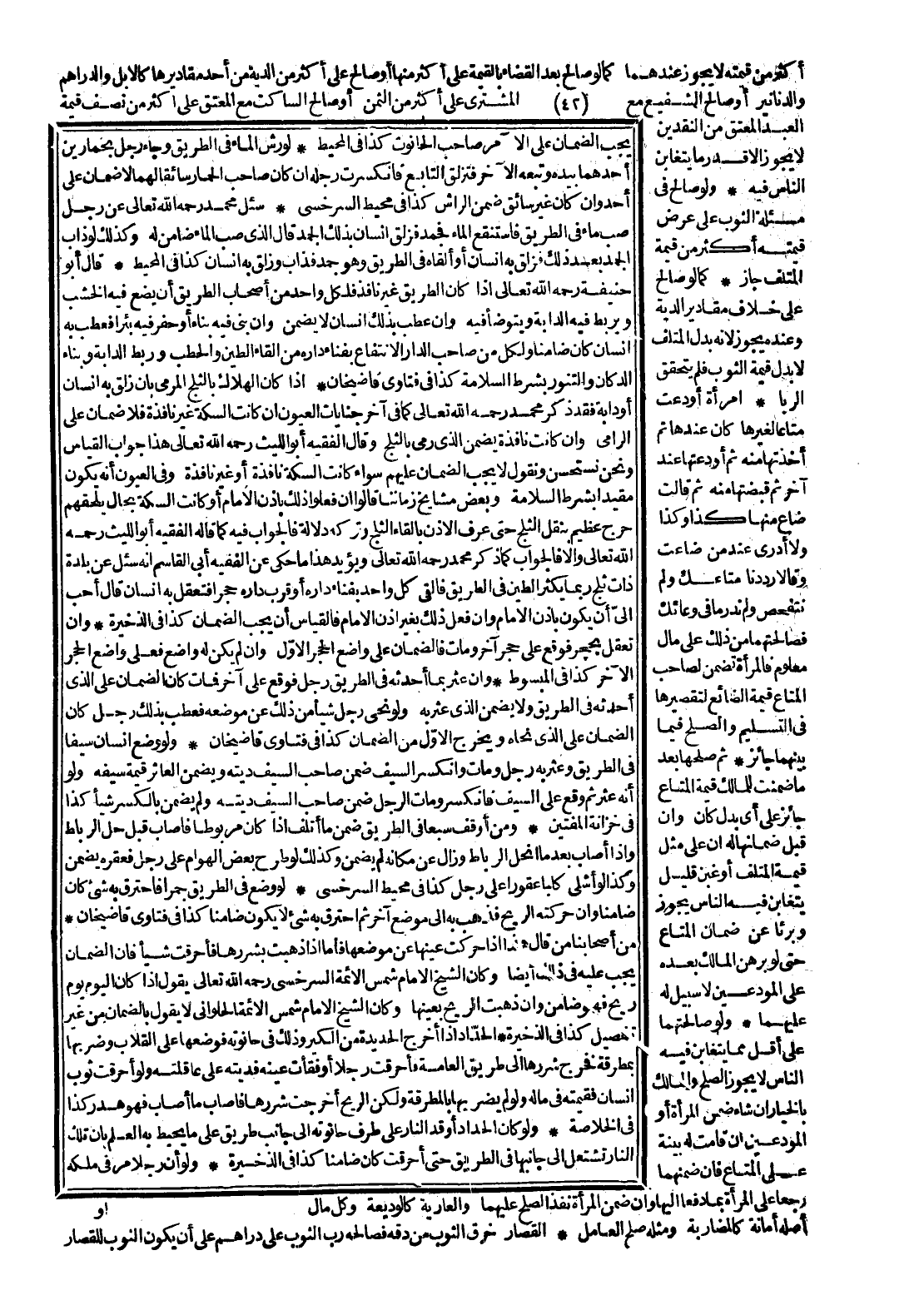 سُئِلَ مُحَمَّدٌ - رَحِمَهُ اللَّهُ تَعَالَى - عَنْ رَجُلٍ صَبَّ مَاءً فِي الطَّرِيقِ فَاسْتُنْقِعَ الْمَاءُ فَجَمَدَ فَزَلِقَ إنْسَانٌ بِذَلِكَ الْجَمْدِ قَالَ: الَّذِي صَبَّ الْمَاءَ ضَامِنٌ لَهُ، وَكَذَلِكَ لَوْ ذَابَ الْجَمْدُ بَعْدَ ذَلِكَ فَزَلِقَ بِهِ إنْسَانٌ، أَوْ أَلْقَاهُ فِي الطَّرِيقِ، وَهُوَ جَمْدٌ فَذَابَ وَزَلِقَ بِهِ إنْسَانٌ كَذَا فِي الْمُحِيطِ. قَالَ أَبُو حَنِيفَةَ - رَحِمَهُ اللَّهُ تَعَالَى -: إذَا كَانَ الطَّرِيقُ غَيْرَ نَافِذٍ فَلِكُلِّ وَاحِدٍ مِنْ أَصْحَابِ الطَّرِيقِ أَنْ يَضَعَ فِيهِ الْخَشَبَ وَيَرْبِطَ فِيهِ الدَّابَّةَ وَيَتَوَضَّأَ فِيهِ، وَإِنْ عَطِبَ بِذَلِكَ إنْسَانٌ لَا يَضْمَنُ، وَإِنْ بَنَى فِيهِ بِنَاءً، أَوْ حَفَرَ فِيهِ بِئْرًا فَعَطِبَ بِهِ إنْسَانٌ كَانَ ضَامِنًا وَلِكُلٍّ مِنْ صَاحِبِ الدَّارِ الِانْتِفَاعُ بِفِنَاءِ دَارِهِ مِنْ إلْقَاءِ الطِّينِ وَالْحَطَبِ وَرَبْطِ الدَّابَّةِ وَبِنَاءِ الدُّكَّانِ وَالتَّنُّورِ بِشَرْطِ السَّلَامَةِ كَذَا فِي فَتَاوَى قَاضِي خَانْ.