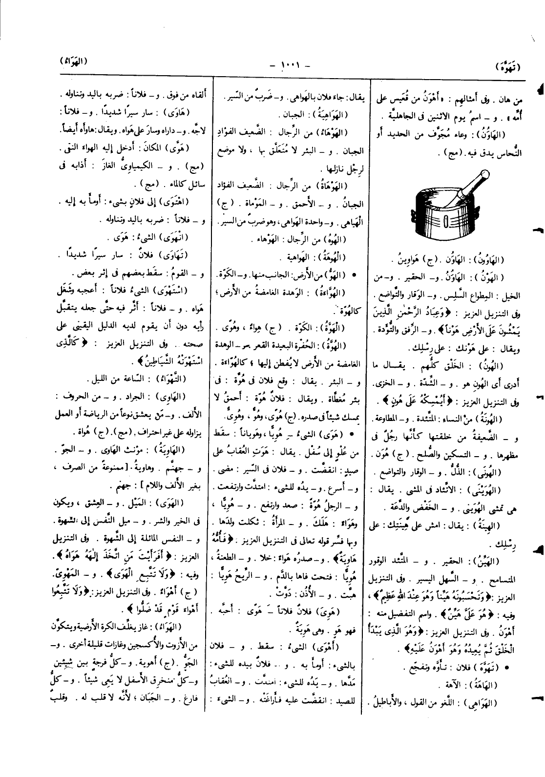 (الْهَوَاء) غاز يغلف الكرة الأرضية ويتكون من الأزوت والأكسجين وغازات قَليلَة أُخْرَى والجو (ج) أهوية وكل فُرْجَة بَين شَيْئَيْنِ وكل منخرق الْأَسْفَل لَا يعي شَيْئا وكل فارغ والجبان لِأَنَّهُ لَا قلب لَهُ وقلب