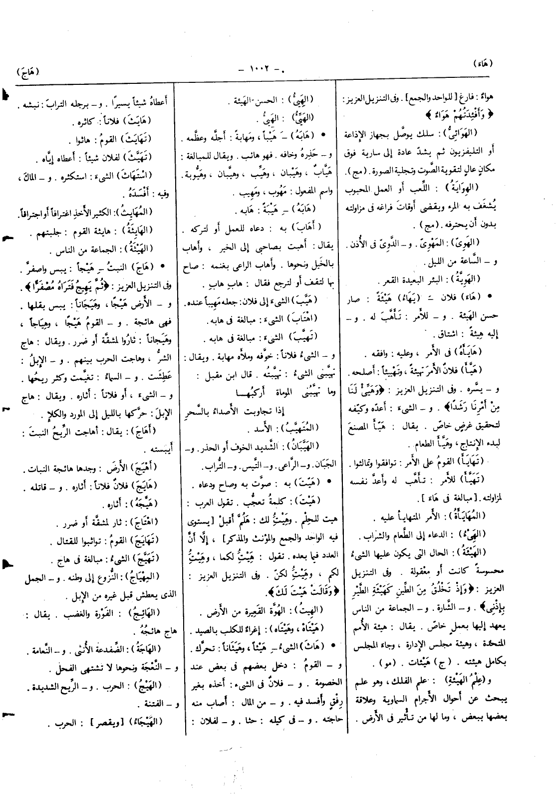 النبت هيجا يبس واصفر وَفِي التَّنْزِيل الْعَزِيز {ثمَّ يهيج فتراه مصفرا} وَالْأَرْض هيجا وهيجانا يبس بقلها فَهِيَ هائجة وَالْقَوْم هيجا وهياجا وهيجانا ثَارُوا لمَشَقَّة أَو ضَرَر وَيُقَال هاج الشَّرّ وهاجت الْحَرْب بَينهم وَالْإِبِل عطشت وَالسَّمَاء تغيمت وَكثر رِيحهَا وَالشَّيْء أَو فلَانا أثاره وَيُقَال هاج الْإِبِل حركها بِاللَّيْلِ إِلَى المورد والكلأ