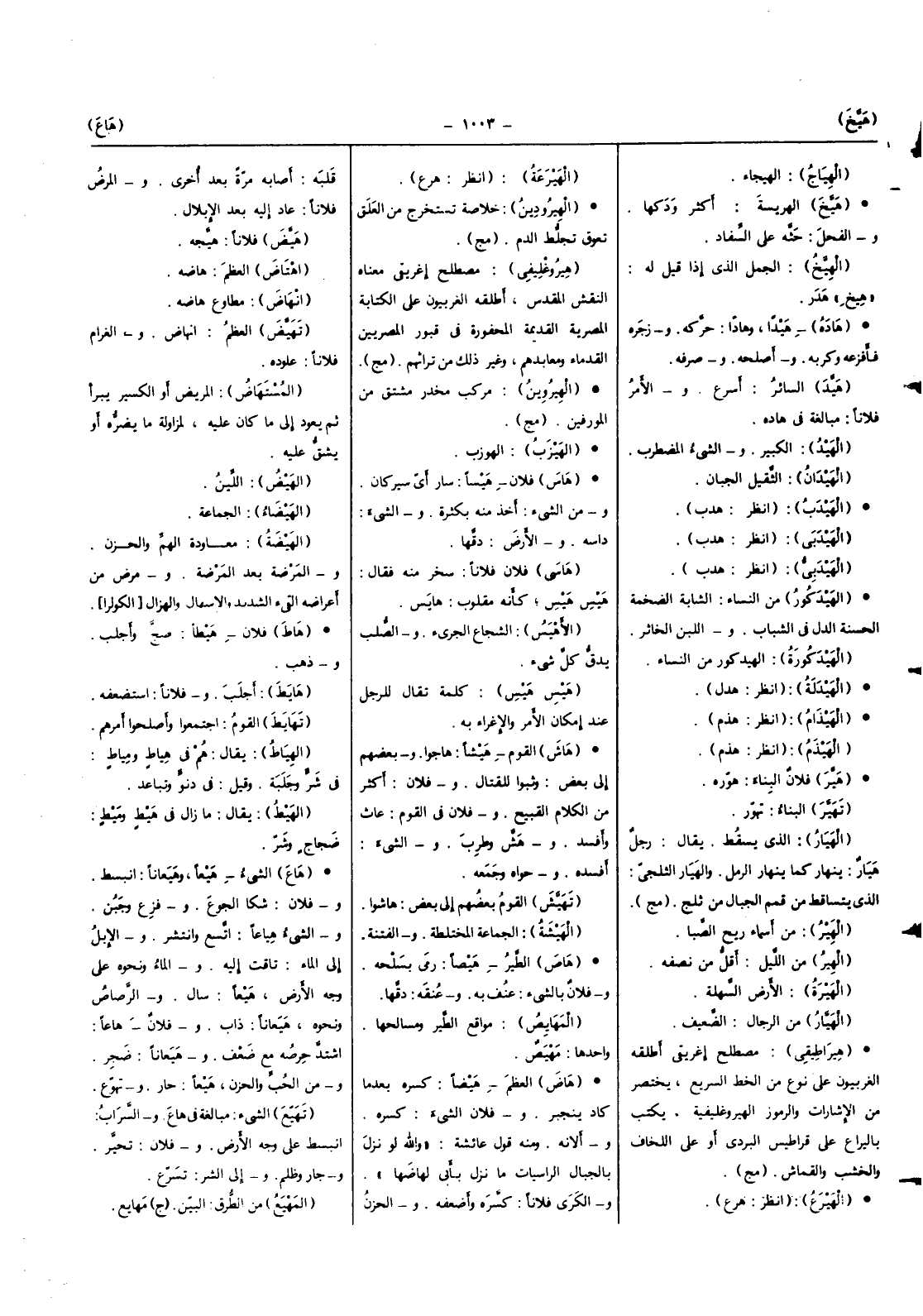 الشَّيْء هيعا وهيعانا انبسط وَفُلَان شكا الْجُوع وفزع وَجبن وَالشَّيْء هياعا اتَّسع وانتشر وَالْإِبِل إِلَى المَاء تاقت إِلَيْهِ وَالْمَاء وَنَحْوه على وَجه الأَرْض هيعا سَالَ والرصاص وَنَحْوه هيعانا ذاب وَفُلَان هاعا اشْتَدَّ حرصه مَعَ ضعف وهيعانا ضجر وَمن الْحبّ والحزن هيعا حَار وتهوع