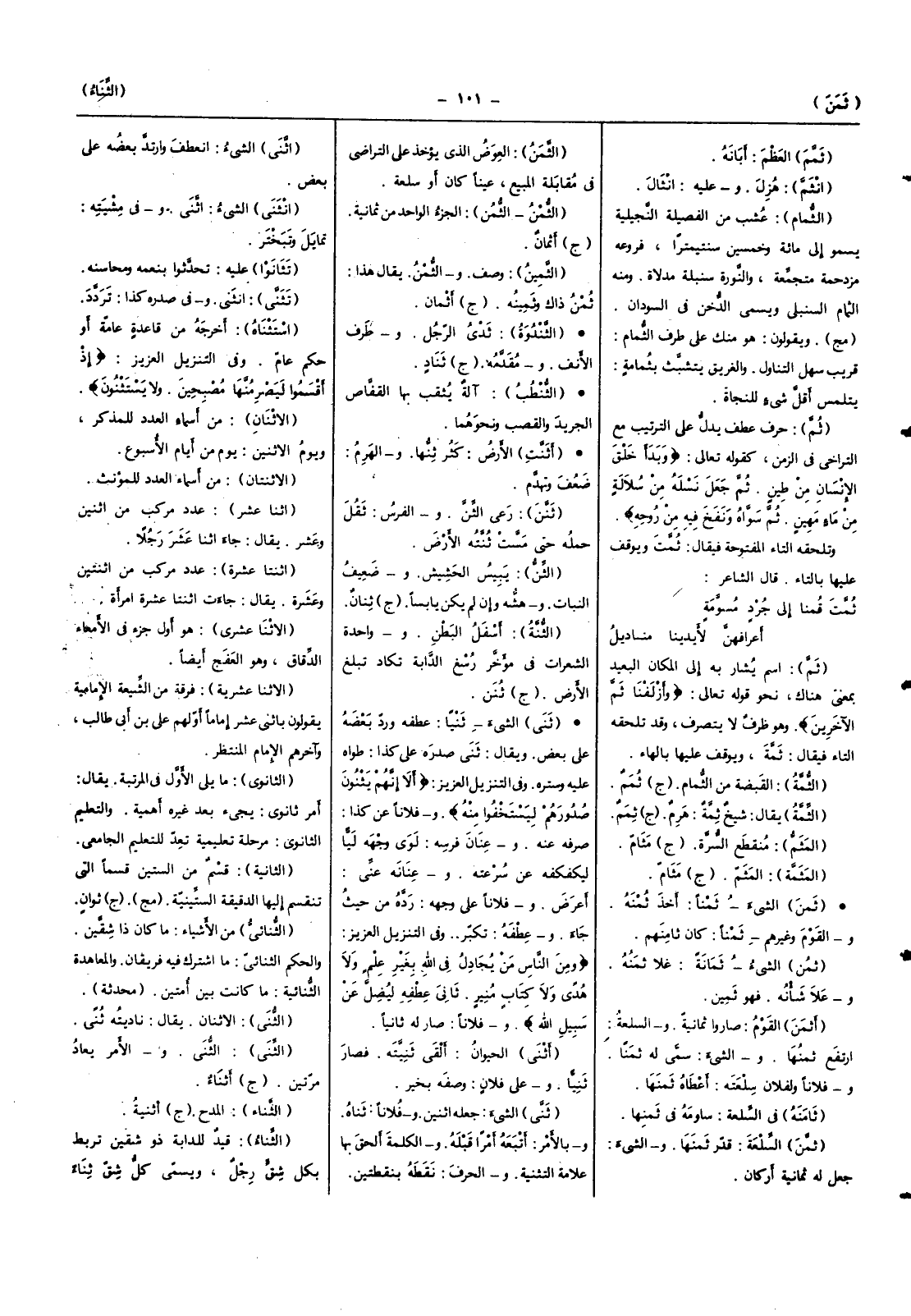 (ثنى) الشَّيْء جعله اثْنَيْنِ وَفُلَانًا ثناه وبالأمر أتبعه أمرا قبله والكلمة ألحق بهَا عَلامَة التَّثْنِيَة والحرف نقطه بنقطتين