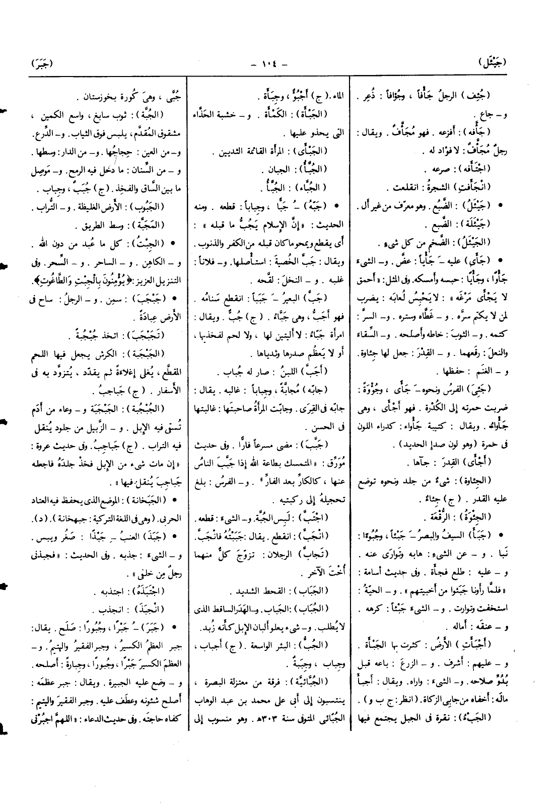 السَّيْف وَالْبَصَر جبئا وجبوءا نبا وَعَن الشَّيْء هابه وتوارى عَنهُ وَعَلِيهِ طلع فَجْأَة وَفِي حَدِيث أُسَامَة (فَلَمَّا رأونا جبئوا من أخبيتهم) والحية استخفت وتوارت وَالشَّيْء جبئا كرهه وعنقه أماله