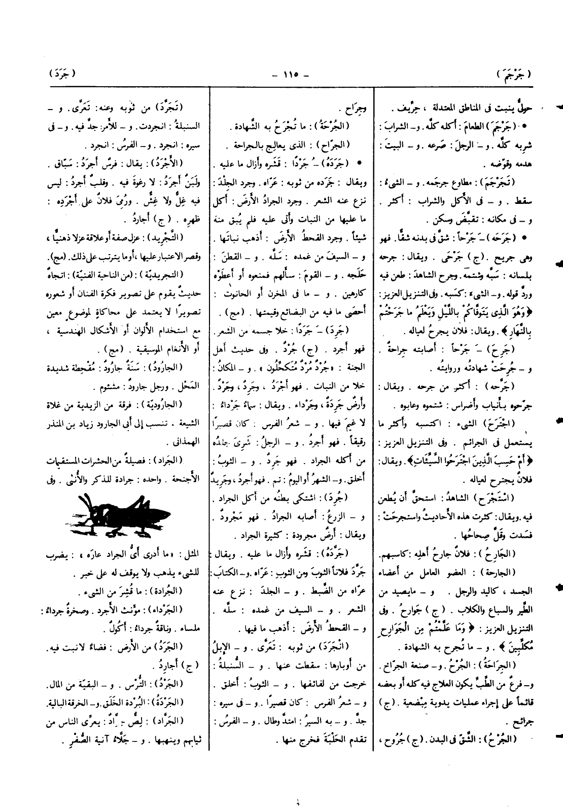 (الْجَرَاد) فصيلة من الحشرات المستقيمات الأجنحة واحده جَرَادَة للذّكر وَالْأُنْثَى وَفِي الْمثل (مَا أَدْرِي أَي الْجَرَاد عاره) يضْرب للشَّيْء يذهب وَلَا يُوقف لَهُ على خبر