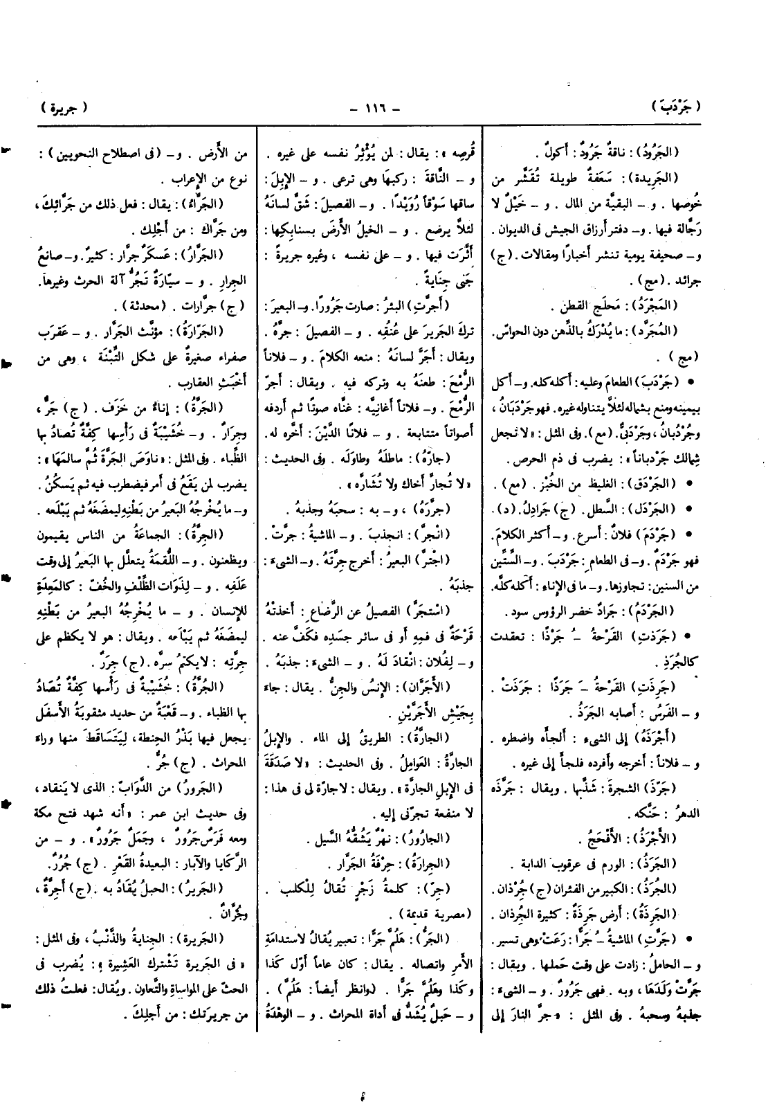 الْمَاشِيَة جرا رعت وَهِي تسير وَالْحَامِل زَادَت على وَقت حملهَا وَيُقَال جرت وَلَدهَا وَبِه فَهِيَ جرور وَالشَّيْء جذبه وسحبه وَفِي الْمثل (جر النَّار إِلَى قرصه) وَيُقَال لمن يُؤثر نَفسه على غَيره والناقة ركبهَا وَهِي ترعى وَالْإِبِل سَاقهَا سوقا رويدا والفصيل شقّ لِسَانه لِئَلَّا يرضع وَالْخَيْل الأَرْض بسنابكها أثرت فِيهَا وعَلى نَفسه وَغَيره جريرة جنى جِنَايَة
