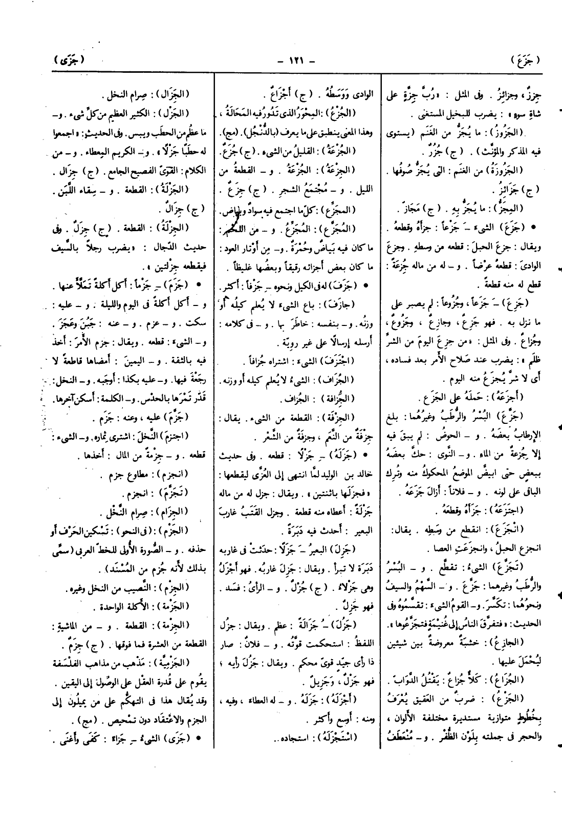 جزما أكل أَكلَة تملأ عَنْهَا وَأكل أَكلَة فِي الْيَوْم وَاللَّيْلَة وَعَلِيهِ سكت وعزم وَعنهُ جبن وَعجز وَالشَّيْء قطعه وَيُقَال جزم الْأَمر أَخذ فِيهِ بالثقة وَالْيَمِين أمضاها قَاطِعَة لَا رَجْعَة فِيهَا وَعَلِيهِ بِكَذَا أوجبه وَالنَّخْل قدر تمرها بالحدس والكلمة أسكن آخرهَا