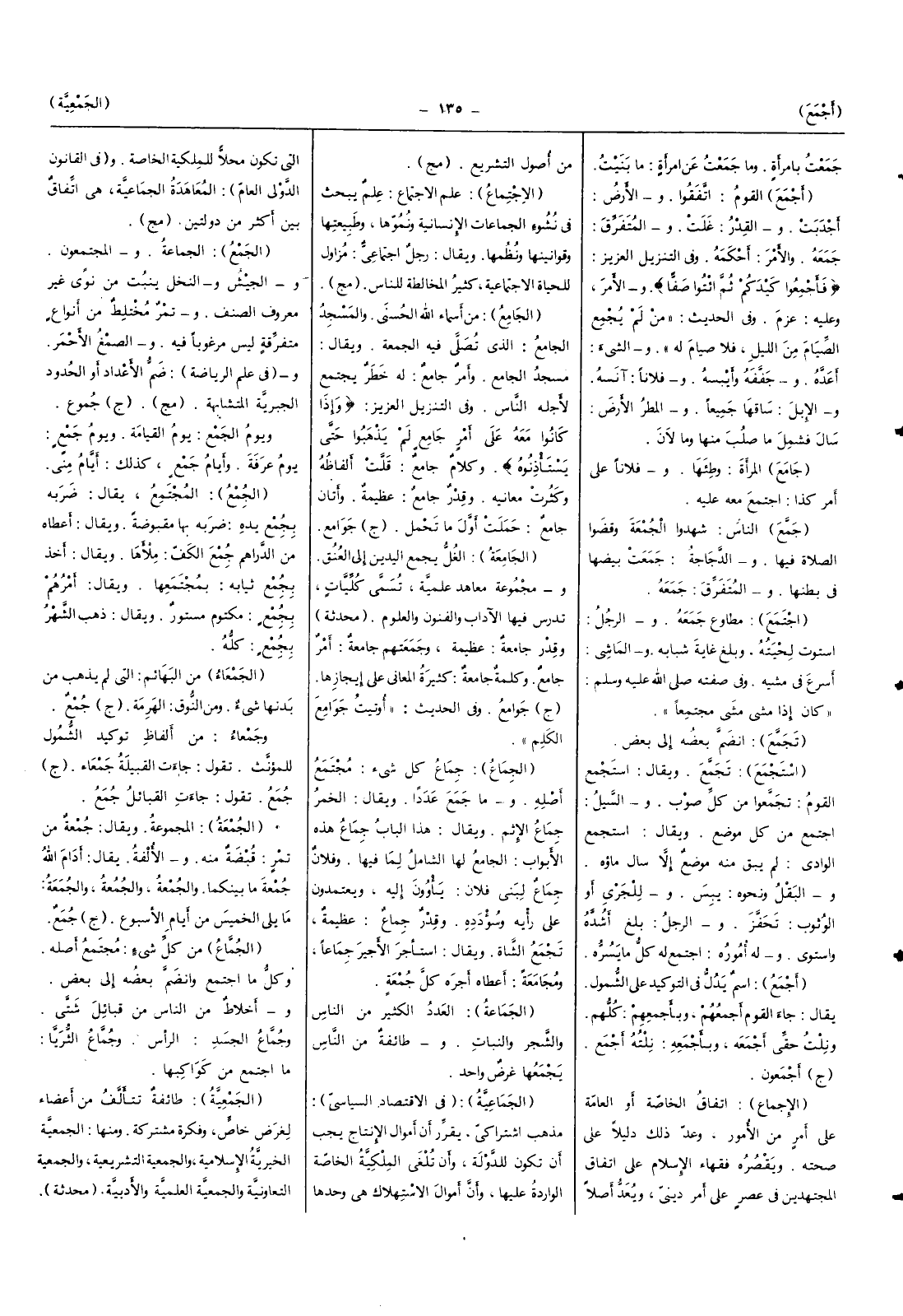 (الْجَمَاعَة) الْعدَد الْكثير من النَّاس وَالشَّجر والنبات وَطَائِفَة من النَّاس يجمعها غَرَض وَاحِد