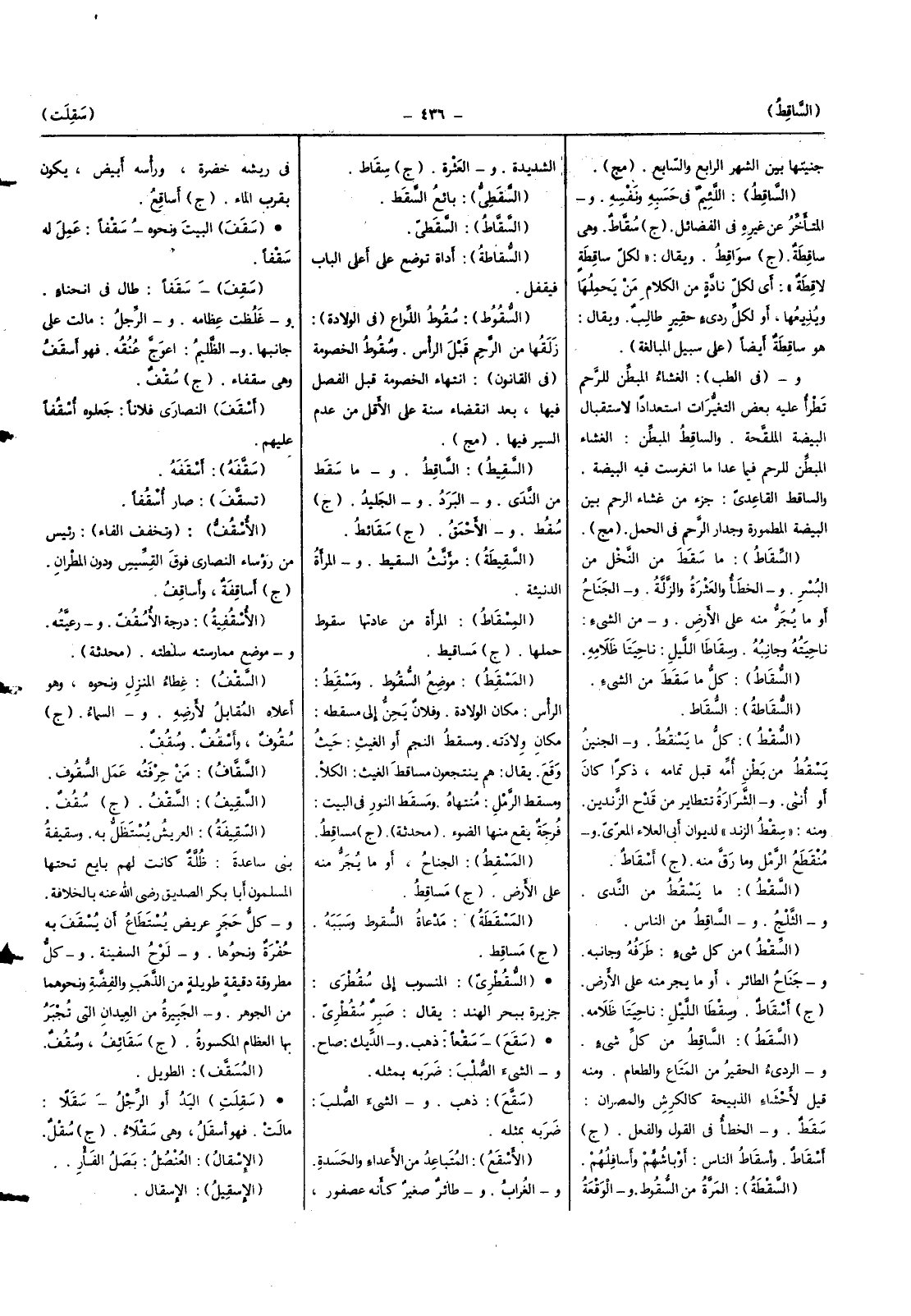 (السَّاقِط) اللَّئِيم فِي حَسبه وَنَفسه والمتأخر عَن غَيره فِي الْفَضَائِل (ج) سقاط وَهِي سَاقِطَة (ج) سواقط وَيُقَال (لكل سَاقِطَة لاقطة) أَي لكل نادة من الْكَلَام من يحملهَا ويذيعها أَو لكل رَدِيء حقير طَالب وَيُقَال هُوَ سَاقِطَة أَيْضا (على سَبِيل الْمُبَالغَة)