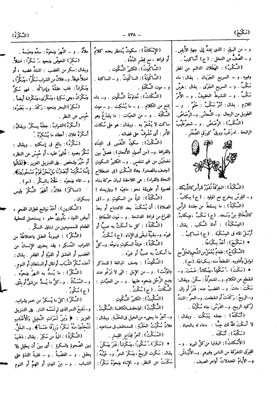 (سكر) الْحَوْض وَنَحْوه سكرا امْتَلَأَ وَيُقَال سكر من الْغَضَب اشْتَدَّ غَضَبه أَو امْتَلَأَ غيظا وَفُلَان من الشَّرَاب سكرا وسكرا وسكرانا غَابَ عقله وإدراكه فَهُوَ سكر وسكران وَهِي سكرة وسكرى وسكرانة أَيْضا