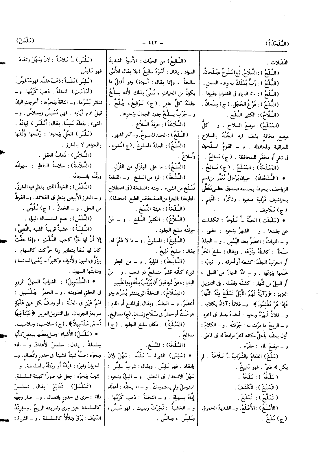 (السالخ) من الْحَيَّات الْأسود الشَّديد السوَاد يُقَال أسود سالخ (وَلَا يُقَال للْأُنْثَى سالخة وَإِنَّمَا يُقَال أَسْوِدَة) وَهُوَ أقتل مَا يكون من الْحَيَّات سمي بذلك لِأَنَّهُ يسلخ جلده كل عَام (ج) سوالخ وسلخ وجرب يسلخ جُلُود الْجمال وَنَحْوهَا