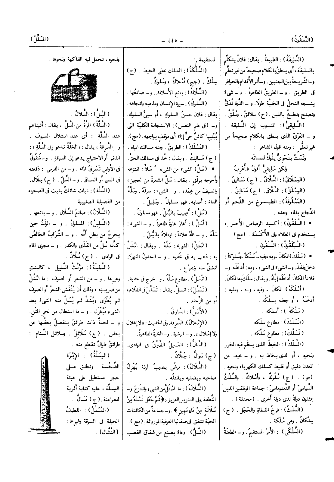 (المسلة) الإبرة الضخمة وَتطلق على حجر مستطيل على هَيْئَة المسلة عَلَيْهِ كِتَابَة أثرية للفراعنة (ج) مسال