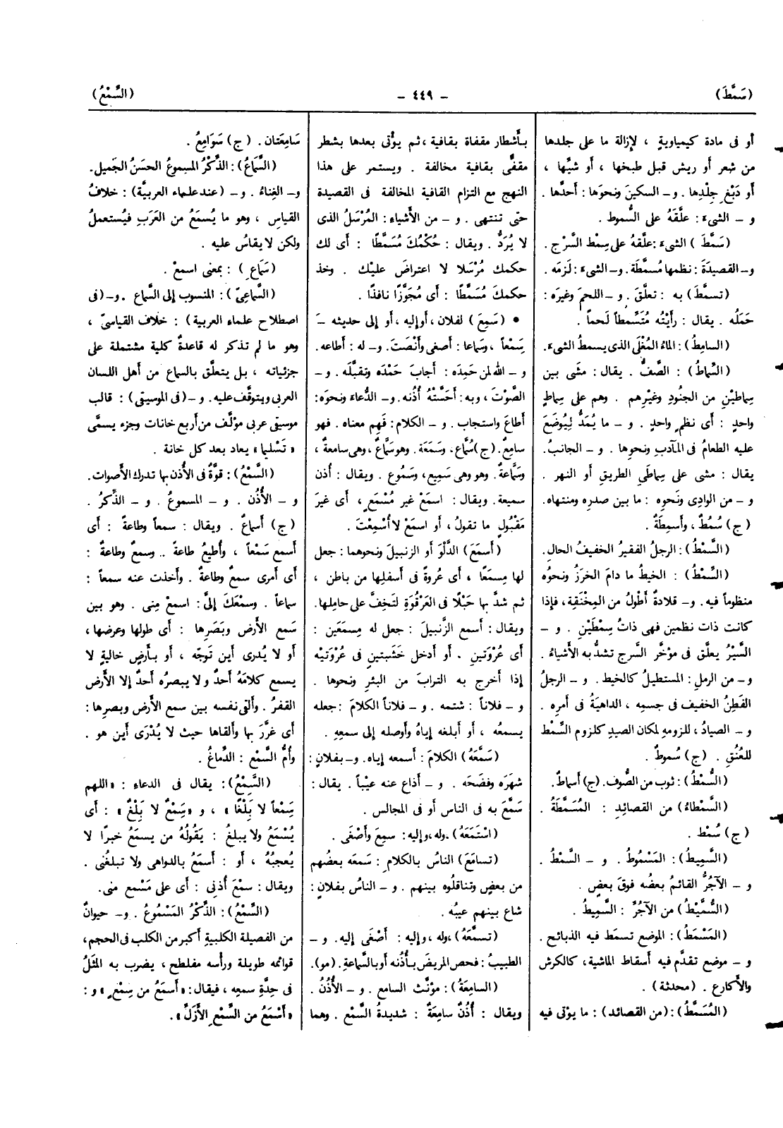 (السّمع) قُوَّة فِي الْأذن بهَا تدْرك الْأَصْوَات وَالْأُذن والمسموع وَالذكر (ج) أسماع وَيُقَال سمعا وَطَاعَة أَي أسمع سمعا وَأطِيع طَاعَة وَسمع وَطَاعَة أَي أَمْرِي سمع وَطَاعَة وَأخذت عَنهُ سمعا سَمَاعا وسمعك إِلَيّ اسْمَع مني وَهُوَ بَين سمع الأَرْض وبصرها أَي طولهَا وعرضها أَو لَا يدرى أَيْن توجه أَو بِأَرْض خَالِيَة لَا يسمع كَلَامه أحد وَلَا يبصره أحد إِلَّا الأَرْض القفر وَألقى نَفسه بَين سمع الأَرْض وبصرها أَي غرر بِهِ وَأَلْقَاهَا حَيْثُ لَا يدرى أَيْن هُوَ وَأم السّمع الدِّمَاغ