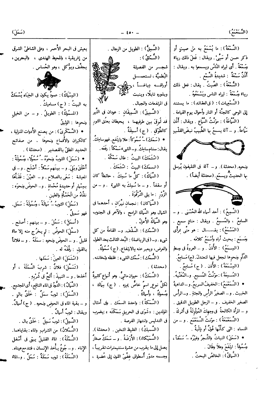 (السّمك) حَيَوَان مائي وَهُوَ أَنْوَاع كَثِيرَة لكل نوع اسْم خَاص يميزه (ج) سماك وسموك وأسماك