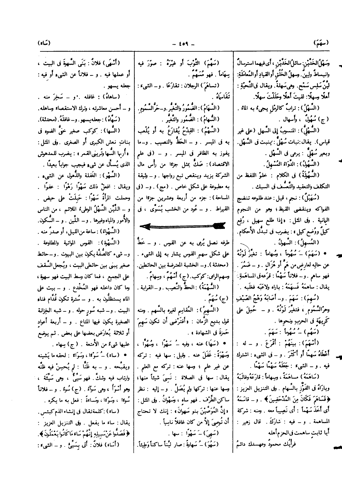(السهْم) الْقدح يقارع بِهِ أَو يلْعَب بِهِ فِي الميسر والحظ والنصيب وَمَا يفوز بِهِ الظافر فِي الميسر و (فِي علم الاقتصاد) صك يمثل جُزْءا من رَأس مَال الشّركَة يزِيد وَينْقص تبع رواجها ووثيقة بِهِ مطبوعة على شكل خَاص (مج) و (فِي المساحة) جُزْء من أَرْبَعَة وَعشْرين جُزْءا من القيراط وعود من الْخشب يسوى فِي طرفه نصل يرْمى بِهِ عَن الْقوس وَخط على شكل سهم الْقوس يشار بِهِ إِلَى الشَّيْء (محدثة) والخشبة المعترضة بَين الحائطين وَسَهْم الرَّامِي كَوْكَب (ج) أسْهم وسهام