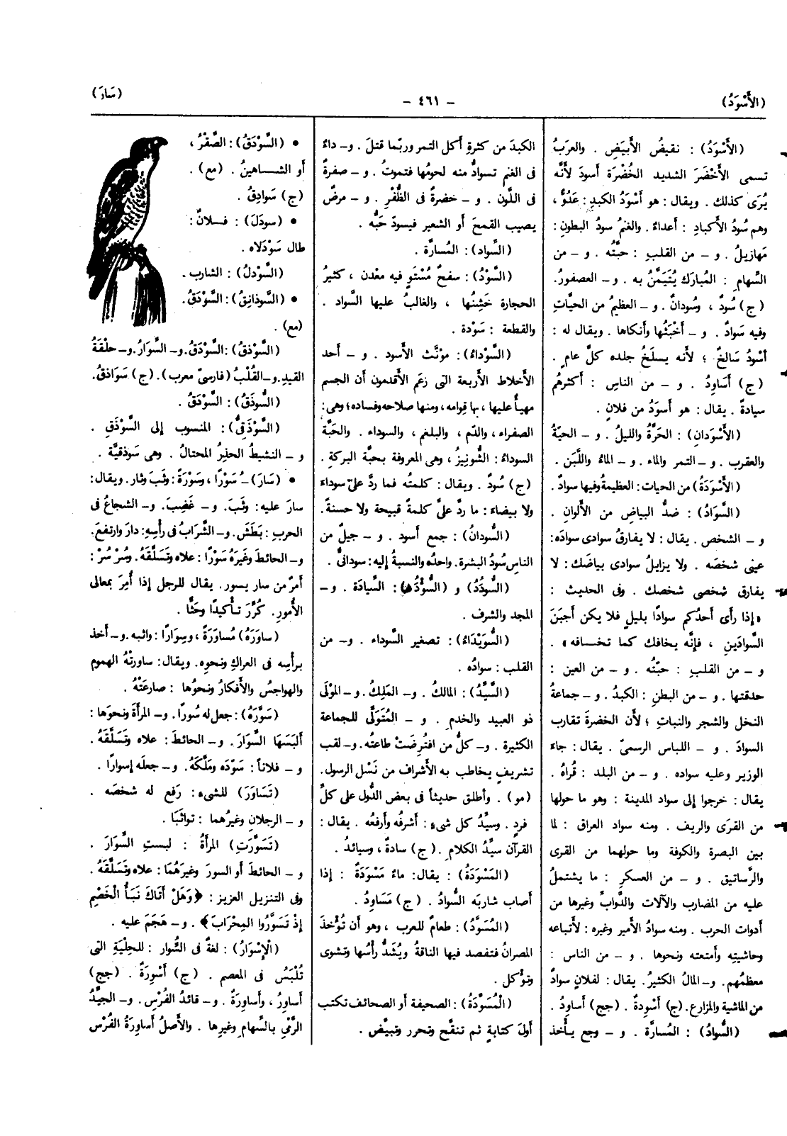 (السوَاد) ضد الْبيَاض من الألوان والشخص يُقَال لَا يُفَارق سوَادِي سوَاده عَيْني شخصه وَلَا يزايل سوَادِي بياضك لَا يُفَارق شخصي شخصك وَفِي الحَدِيث (إِذا رأى أحدكُم سوادا بلَيْل فَلَا يكن أجبن السوادين فَإِنَّهُ يخافك كَمَا تخافه) وَمن الْقلب حبته وَمن الْعين حدقتها وَمن الْبَطن الكبد وَجَمَاعَة النّخل وَالشَّجر والنبات لِأَن الخضرة تقَارب السوَاد واللبس الرسمي يُقَال جَاءَ الْوَزير وَعَلِيهِ سوَاده وَمن الْبَلَد قراه يُقَال خَرجُوا إِلَى سَواد الْمَدِينَة وَهُوَ مَا حولهَا من الْقرى والريف وَمِنْه سود الْعرَاق لما بَين الْبَصْرَة والكوفة وَمَا حولهما من الْقرى والرساتيق وَمن الْعَسْكَر مَا يشْتَمل عَلَيْهِ من الْمضَارب والآلات وَالدَّوَاب وَغَيرهَا من أدوات الْحَرْب وَمِنْه سَواد الْأَمِير وَغَيره لأتباعه وحاشيته وأمتعته وَنَحْوهَا وَمن النَّاس معظمهم وَالْمَال الْكثير يُقَال لفُلَان سَواد من الْمَاشِيَة والمزارع (ج) أَسْوِدَة (جج) أساود
