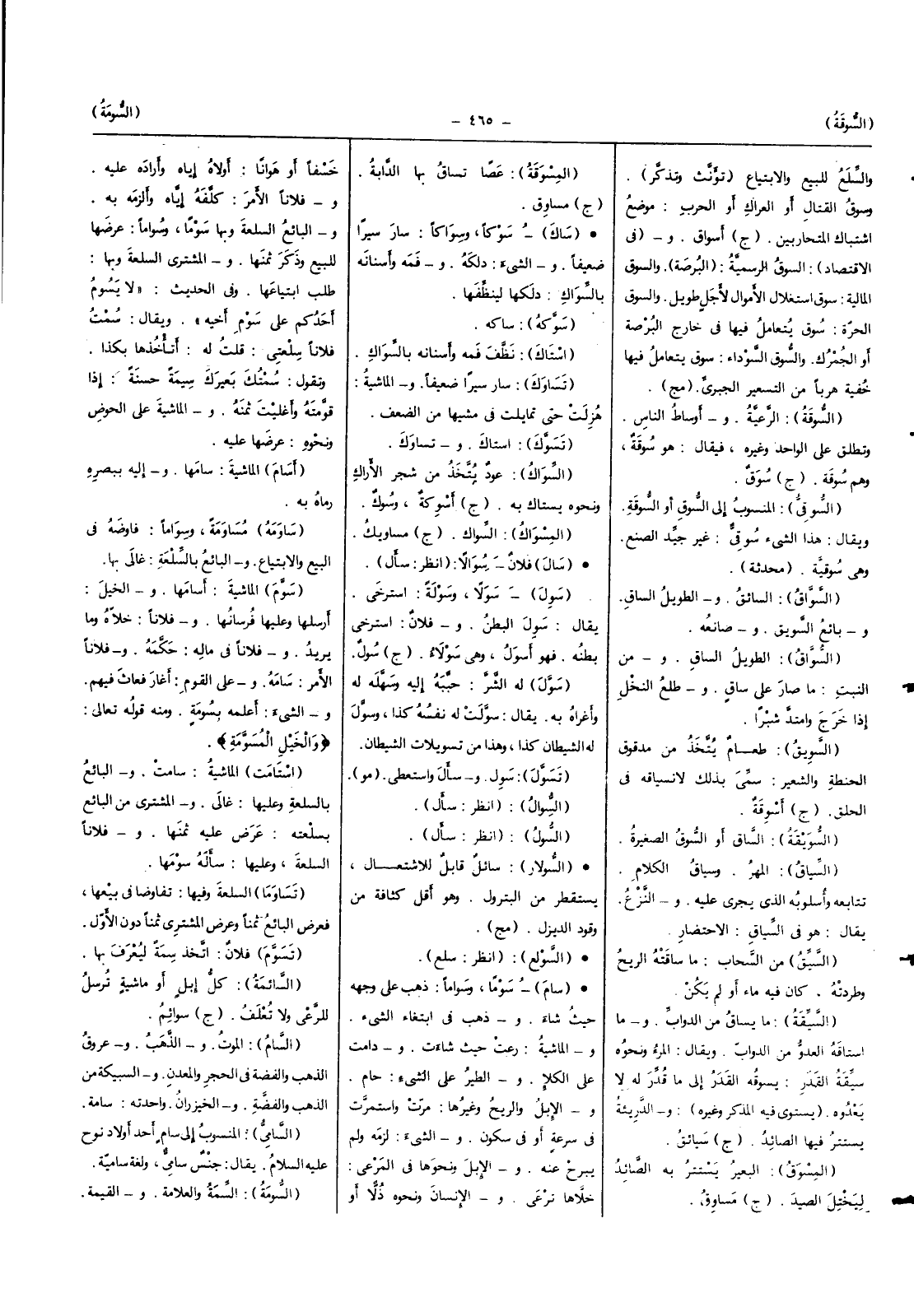 سوما وسواما ذهب على وَجهه حَيْثُ شَاءَ وَذهب فِي ابْتِغَاء الشَّيْء والماشية رعت حَيْثُ شَاءَت ودامت على الْكلأ وَالطير على الشَّيْء حام وَالْإِبِل وَالرِّيح وَغَيرهَا مرت واستمرت فِي سرعَة أَو فِي سُكُون وَالشَّيْء لزمَه وَلم يبرح عَنهُ وَالْإِبِل وَنَحْوهَا فِي المرعى خَلاهَا ترعى وَالْإِنْسَان وَنَحْوه ذلا أَو خسفا أَو هوانا أولاه إِيَّاه وأراده عَلَيْهِ وَفُلَانًا الْأَمر كلفه إِيَّاه وألزمه بِهِ وَالْبَائِع السّلْعَة وَبهَا سوما وسواما عرضهَا للْبيع وَذكر ثمنهَا وَالْمُشْتَرِي السّلْعَة وَبهَا طلب ابتياعها وَفِي الحَدِيث (لَا يسوم أحدكُم على سوم أَخِيه) وَيُقَال سمت فلَانا سلعتي قلت لَهُ أتأخذها بِكَذَا وَتقول سمتك بعيرك سيمة حَسَنَة إِذا قومته وأغليت ثمنه والماشية على الْحَوْض وَنَحْوه عرضهَا عَلَيْهِ