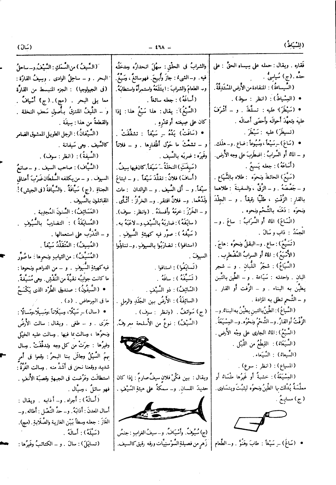 (السَّيْف) نوع من الأسلحة مَعْرُوف وَيُقَال بَين فكي فلَان سيف صارم إِذْ كَانَ حَدِيد اللِّسَان وسمكة على هَيْئَة السَّيْف (ج) سيوف وأسياف وَسيف الْغُرَاب جنس زهر من فصيلة السوسنيات ورقه رَقِيق كالسيف