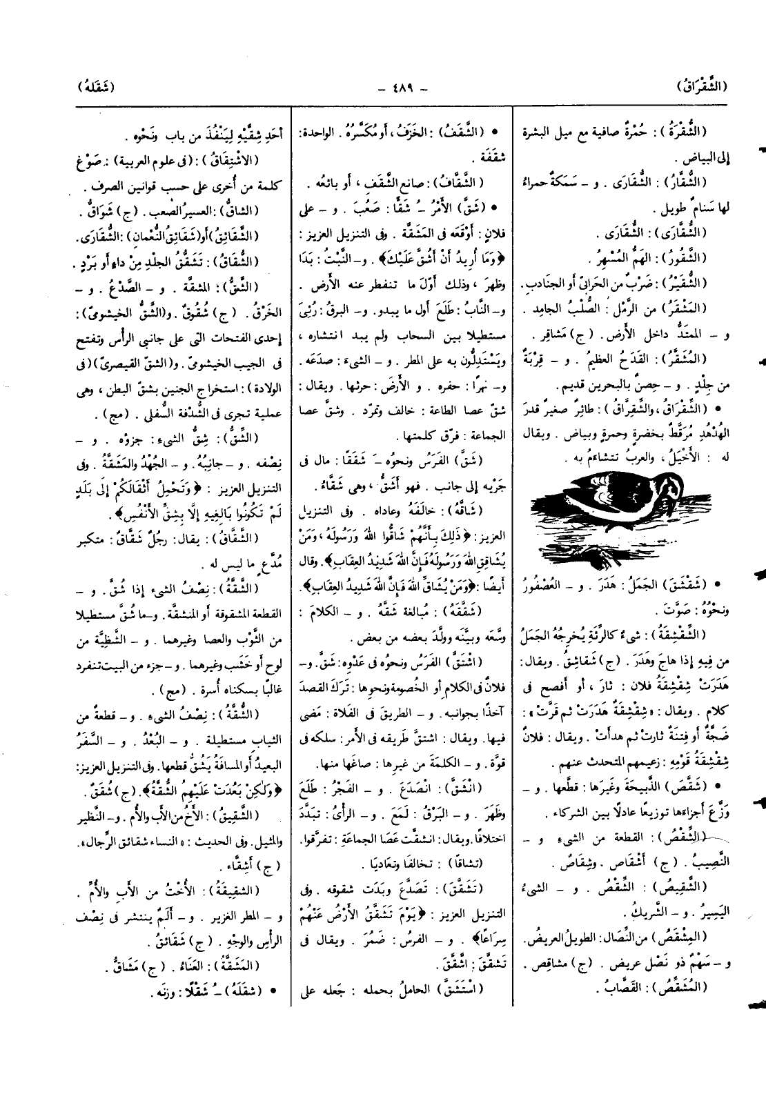 الْأَمر شقا صَعب وعَلى فلَان أوقعه فِي الْمَشَقَّة وَفِي التَّنْزِيل الْعَزِيز {وَمَا أُرِيد أَن أشق عَلَيْك} والنبت بدا وَظهر وَذَلِكَ أول مَا تنفطر عَنهُ الأَرْض والناب طلع أول مَا يَبْدُو والبرق رئي مستطيلا بَين السَّحَاب وَلم يبد انتشاره ويستدلون بِهِ على الْمَطَر وَالشَّيْء صدعه ونهرا حفره وَالْأَرْض حرثها وَيُقَال شقّ عَصا الطَّاعَة خَالف وتمرد وشق عَصا الْجَمَاعَة فرق كلمتها