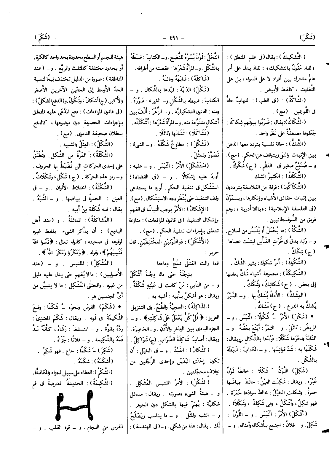 (الشكل) الْأَمر الملتبس الْمُشكل وهيئة الشَّيْء وَصورته وَيُقَال مسَائِل شكلية يهتم فِيهَا بالشكل دون الْجَوْهَر والشبه والمثل وَمَا يُنَاسب وَيصْلح لَك يُقَال هَذَا من شكلي و (فِي الهندسة) هَيْئَة للجسم أَو السَّطْح محدودة بِحَدّ وَاحِد كالكرة أَو بحدود مُخْتَلفَة كالمثلث والمربع و (عِنْد المناطقة) صُورَة من الدَّلِيل تخْتَلف تبعا لنسبة الْحَد الْأَوْسَط إِلَى الحدين الآخرين الْأَصْغَر والأكبر (ج) أشكال وشكول و (الدّفع الشكلي) (فِي قانون المرافعات) دفع الْمُدعى عَلَيْهِ الْمُتَعَلّق بإجراءات الْخُصُومَة دون موضوعها كالدفع بِبُطْلَان صحيفَة الدَّعْوَى (مج)