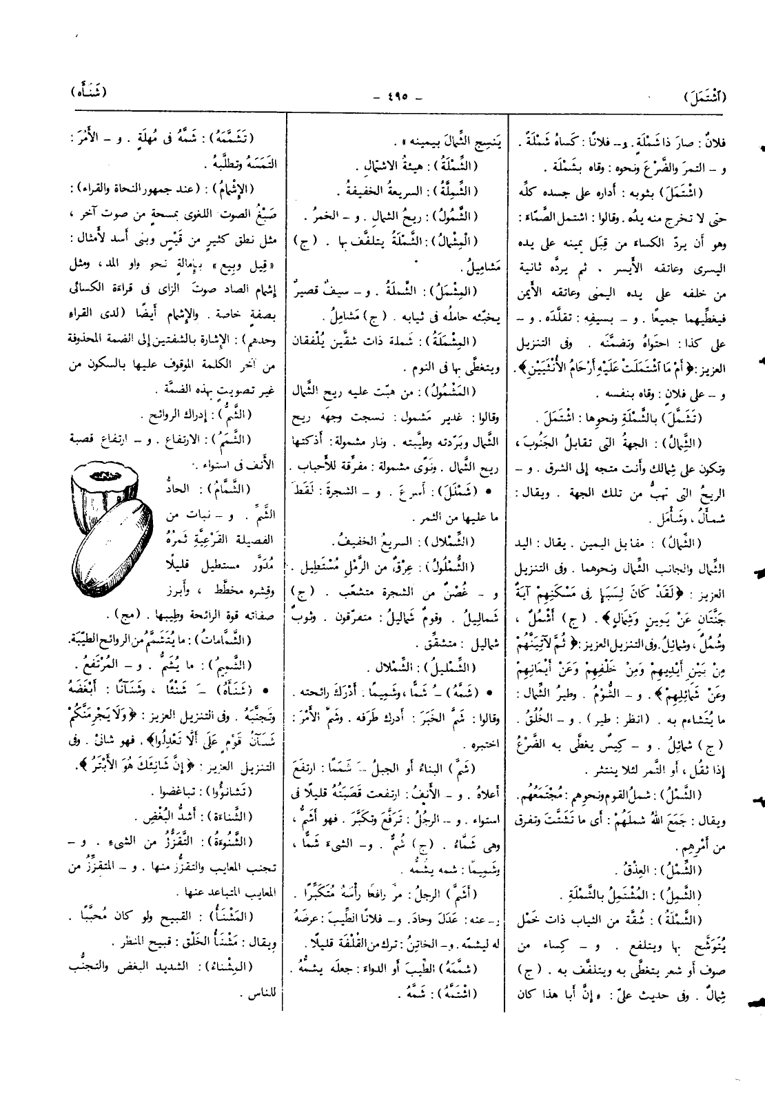 (الشمَال) مُقَابل الْيَمين يُقَال الْيَد الشمَال والجانب الشمَال وَنَحْوهمَا وَفِي التَّنْزِيل الْعَزِيز {لقد كَانَ لسبإ فِي مسكنهم آيَة جنتان عَن يَمِين وشمال} (ج) أشمل وَشَمل وشمائل وَفِي التَّنْزِيل الْعَزِيز {ثمَّ لآتينهم من بَين أَيْديهم وَمن خَلفهم وَعَن أَيْمَانهم وَعَن شمائلهم} والشؤم وطير الشمَال مَا يتشاءم بِهِ (انْظُر طير) والخلق (ج) شمائل وكيس يغطى بِهِ الضَّرع إِذا ثقل أَو التَّمْر لِئَلَّا ينتشر