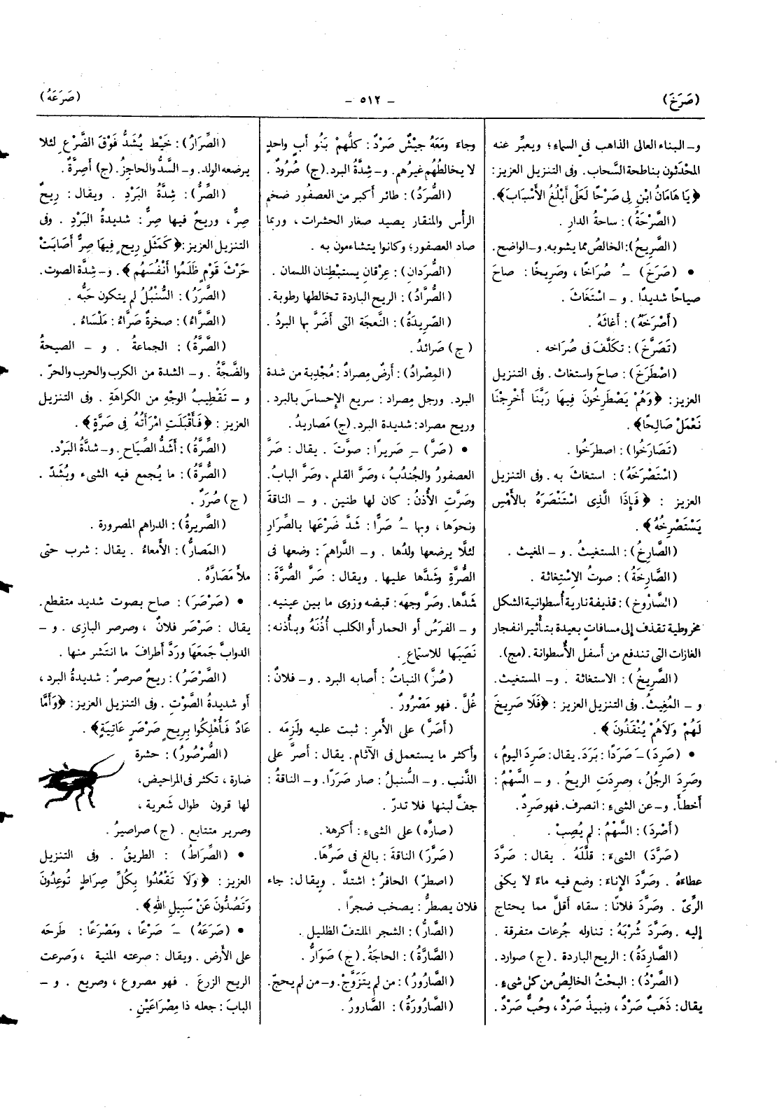 (الصر) شدَّة الْبرد وَيُقَال ريح صر وريح فِيهَا صر شَدِيدَة الْبرد وَفِي التَّنْزِيل الْعَزِيز {كَمثل ريح فِيهَا صر أَصَابَت حرث قوم ظلمُوا أنفسهم} وَشدَّة الصَّوْت
