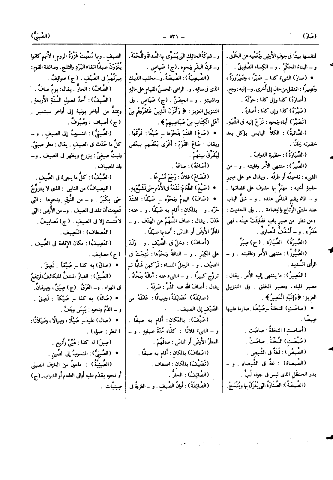 الْيَوْم وَنَحْوه صيفا اشْتَدَّ حره وبالمكان أَقَامَ بِهِ صيفا وَعنهُ عدل يُقَال صَاف السهْم عَن الهدف والمطر الأَرْض أَو النَّاس أَصَابَهَا صيفا