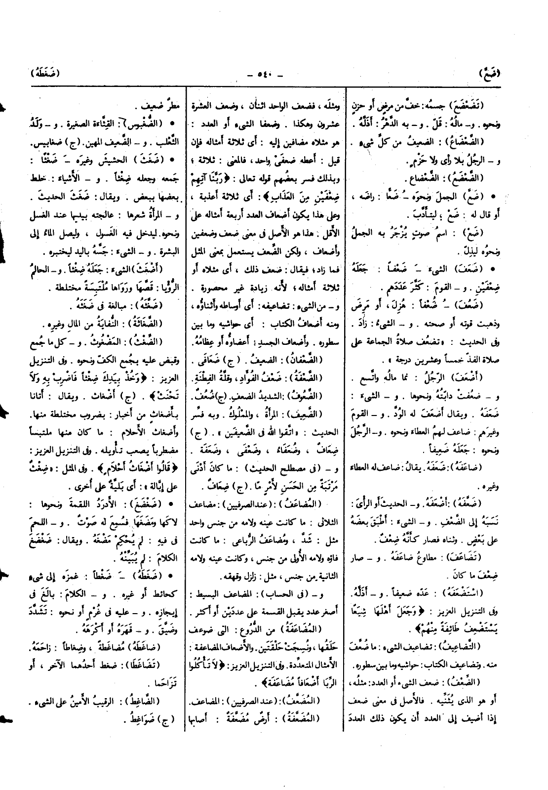 (الضعْف) ضعف الشَّيْء أَو الْعدَد مثله أَو هُوَ الَّذِي يثنيه فَالْأَصْل فِي معنى ضعف إِذا أضيف إِلَى الْعدَد أَن يكون ذَلِك الْعدَد وَمثله فضعف الْوَاحِد اثْنَان وَضعف الْعشْرَة عشرُون وَهَكَذَا وضعفا الشَّيْء أَو الْعدَد هُوَ مثلاه مضافين إِلَيْهِ أَي ثَلَاثَة أَمْثَاله فَإِن قيل أعْطه ضعْفي وَاحِد فَالْمَعْنى ثَلَاثَة وَبِذَلِك فسر بَعضهم قَوْله تَعَالَى {رَبنَا آتهم ضعفين من الْعَذَاب} أَي ثَلَاثَة أعذبة وعَلى هَذَا يكون أَضْعَاف الْعدَد أَرْبَعَة أَمْثَاله على الْأَقَل هَذَا هُوَ الأَصْل فِي معنى ضعف وضعفين وأضعاف وَلَكِن الضعْف يسْتَعْمل بِمَعْنى الْمثل فَمَا زَاد فَيُقَال ضعف ذَلِك أَي مثلاه أَو ثَلَاثَة أَمْثَاله لِأَنَّهُ زِيَادَة غير محصورة وَمن الشَّيْء تضاعيفه أَي أوساطه وأثناؤه وَمِنْه أَضْعَاف الْكتاب أَي حَوَاشِيه وَمَا بَين سطوره وأضعاف الْجَسَد أعضاؤه أَو عِظَامه