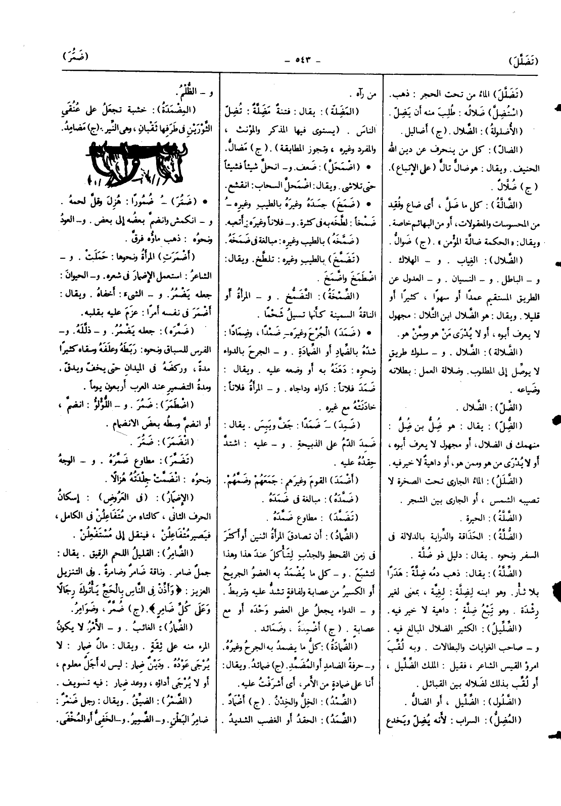 (الضلال) الغياب والهلاك وَالْبَاطِل وَالنِّسْيَان والعدول عَن الطَّرِيق الْمُسْتَقيم عمدا أَو سَهوا كثيرا وقليلا وَيُقَال هُوَ الضلال ابْن التلال مَجْهُول لَا يعرف أَبوهُ أَو لَا يدرى من هُوَ وَمِمَّنْ هُوَ