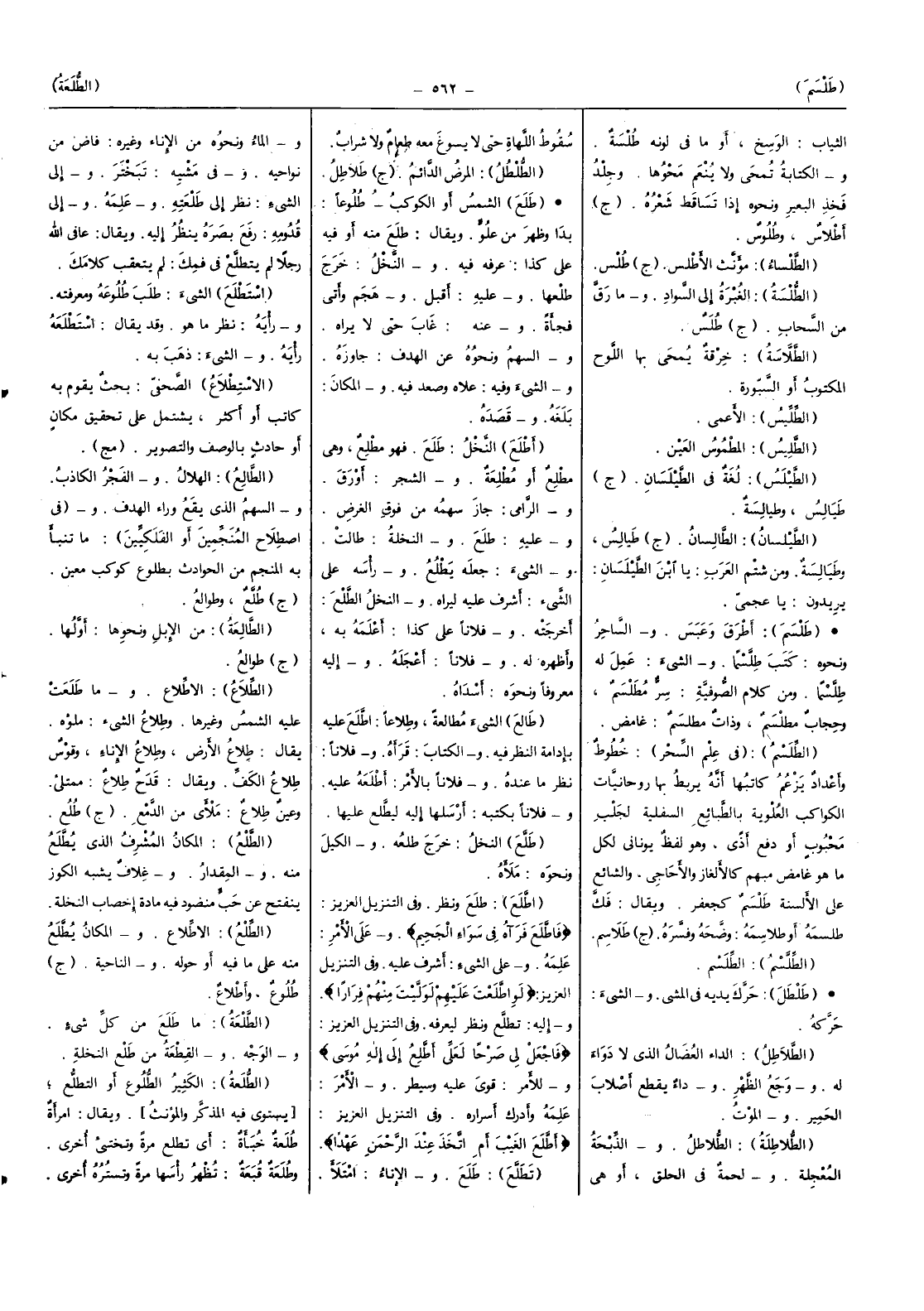 (اطلع) طلع وَنظر وَفِي التَّنْزِيل الْعَزِيز {فَاطلع فَرَآهُ فِي سَوَاء الْجَحِيم} وعَلى الْأَمر علمه وعَلى لشَيْء أشرف عَلَيْهِ وَفِي التَّنْزِيل الْعَزِيز {لَو اطَّلَعت عَلَيْهِم لَوَلَّيْت مِنْهُم فِرَارًا} وَإِلَيْهِ تطلع وَنظر ليعرفه وَفِي التَّنْزِيل الْعَزِيز {فَاجْعَلْ لي صرحا لعَلي أطلع إِلَى إِلَه مُوسَى} وللأمر قوى عَلَيْهِ وسيطر وَالْأَمر علمه وَأدْركَ أسراره وَفِي التَّنْزِيل الْعَزِيز {أطلع الْغَيْب أم اتخذ عِنْد الرَّحْمَن عهدا}