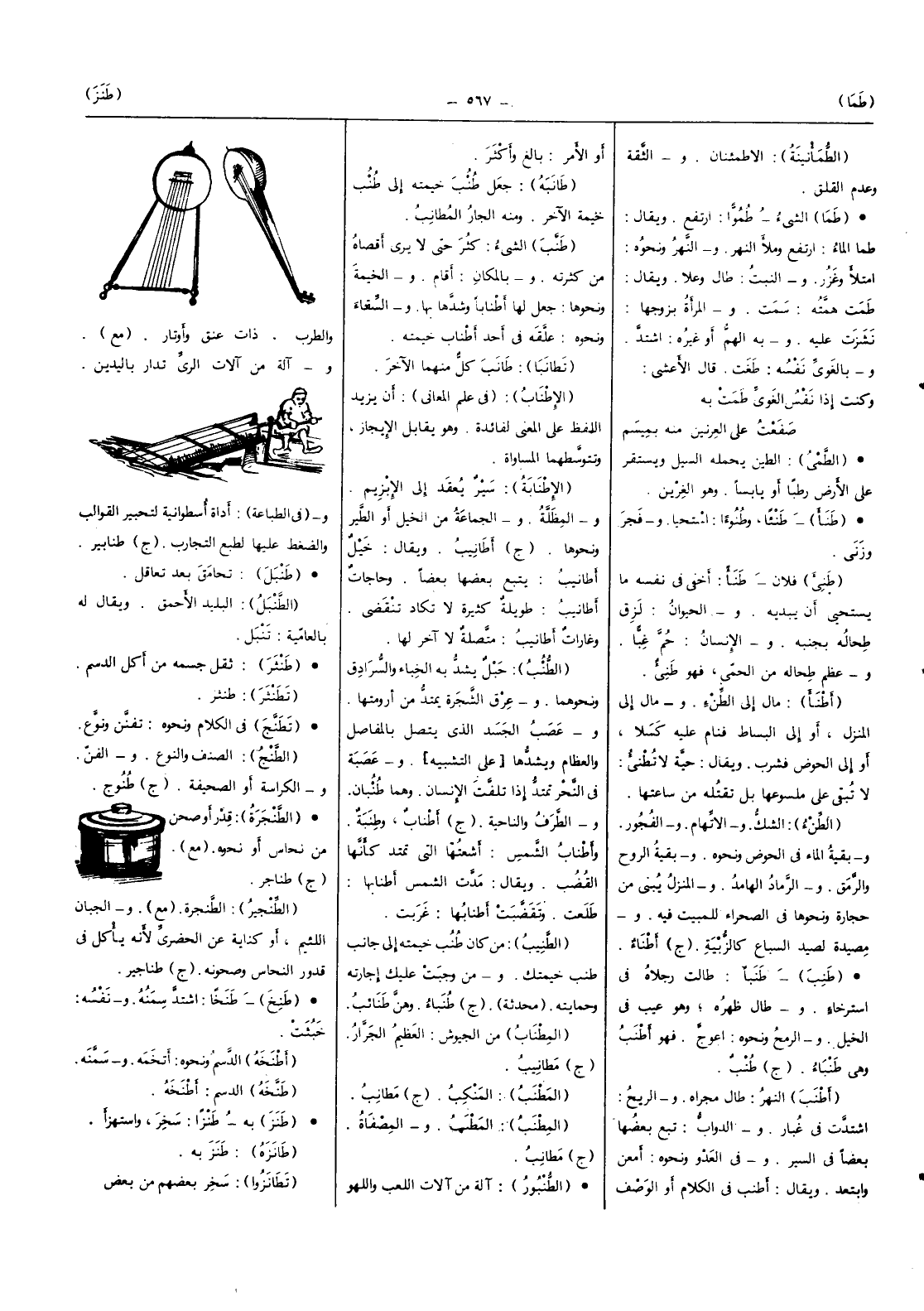 آلَة من آلَات اللّعب وَاللَّهْو والطرب ذَات عنق وأوتار (مَعَ) وَآلَة من آلَات الرّيّ تدار باليدين و (فِي الطباعة) أَدَاة أسطوانية لتحبير القوالب والضغط عَلَيْهَا لطبع التجارب (ج) طنابير