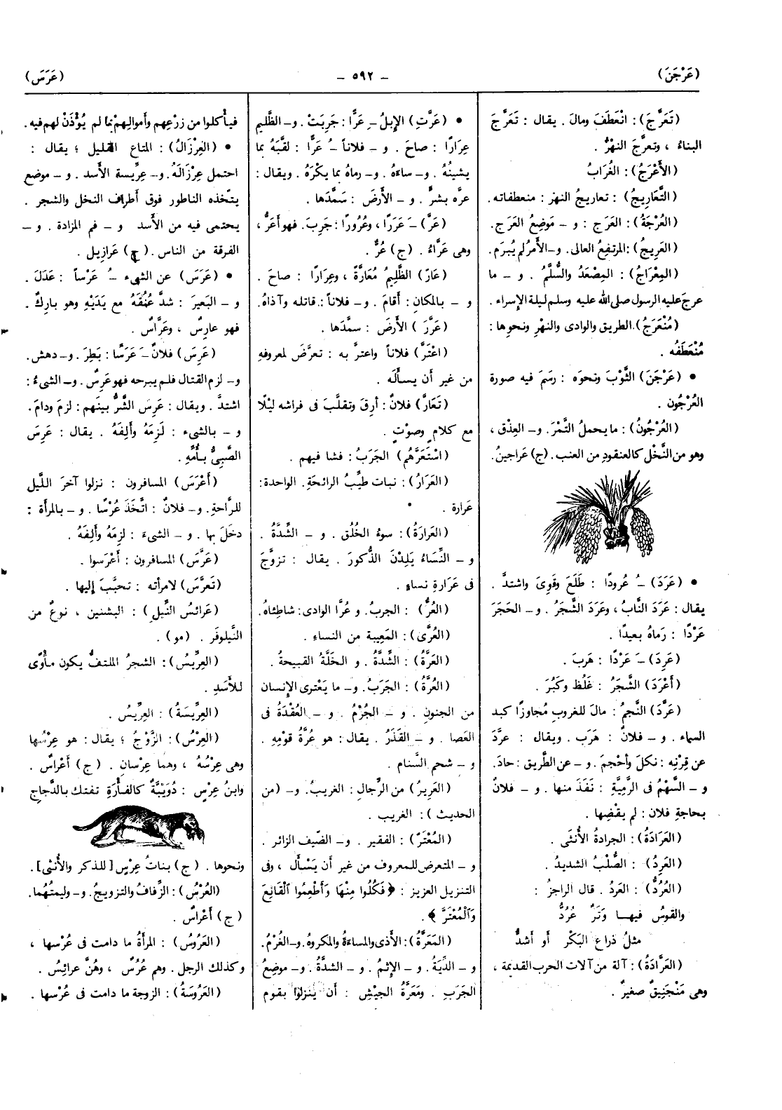 (الْعرس) الزَّوْج يُقَال هُوَ عرسها وَهِي عرسه وهما عرسان (ج) أعراس وَابْن عرس دويبة كالفأرة تفتك بالدجاج وَنَحْوهَا (ج) بَنَات عرس (للذّكر وَالْأُنْثَى)