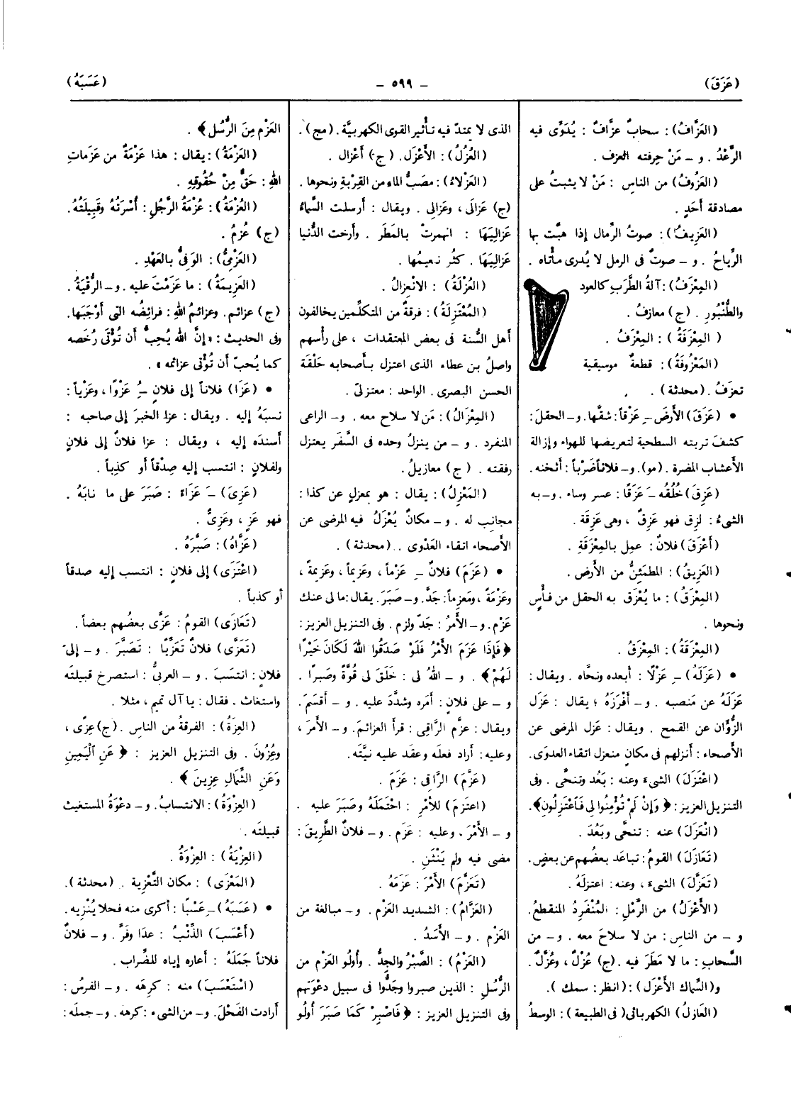 (الْعِزَّة) الْفرْقَة من النَّاس (ج) عزى وعزون وَفِي التَّنْزِيل الْعَزِيز {عَن الْيَمين وَعَن الشمَال عزين}