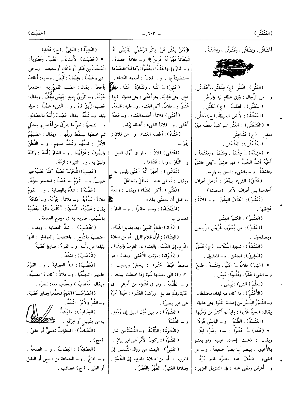 (عشا) - عشوا سَاءَ بَصَره لَيْلًا وَيُقَال ذهبت إِحْدَى عَيْنَيْهِ وَهُوَ يعشو بِالْأُخْرَى يبصر بهَا بصرا ضَعِيفا وَعَن الشَّيْء ضعف عَنهُ بَصَره فَلم يره وَأعْرض وَمضى عَنهُ وَفِي التَّنْزِيل الْعَزِيز {وَمن يَعش عَن ذكر الرَّحْمَن نقيض لَهُ شَيْطَانا فَهُوَ لَهُ قرين} وَفُلَانًا قَصده وَالنَّار وإليها عشوا وعشوا رَآهَا لَيْلًا فقصدها مستضيئا بهَا وَفُلَانًا أطْعمهُ الْعشَاء