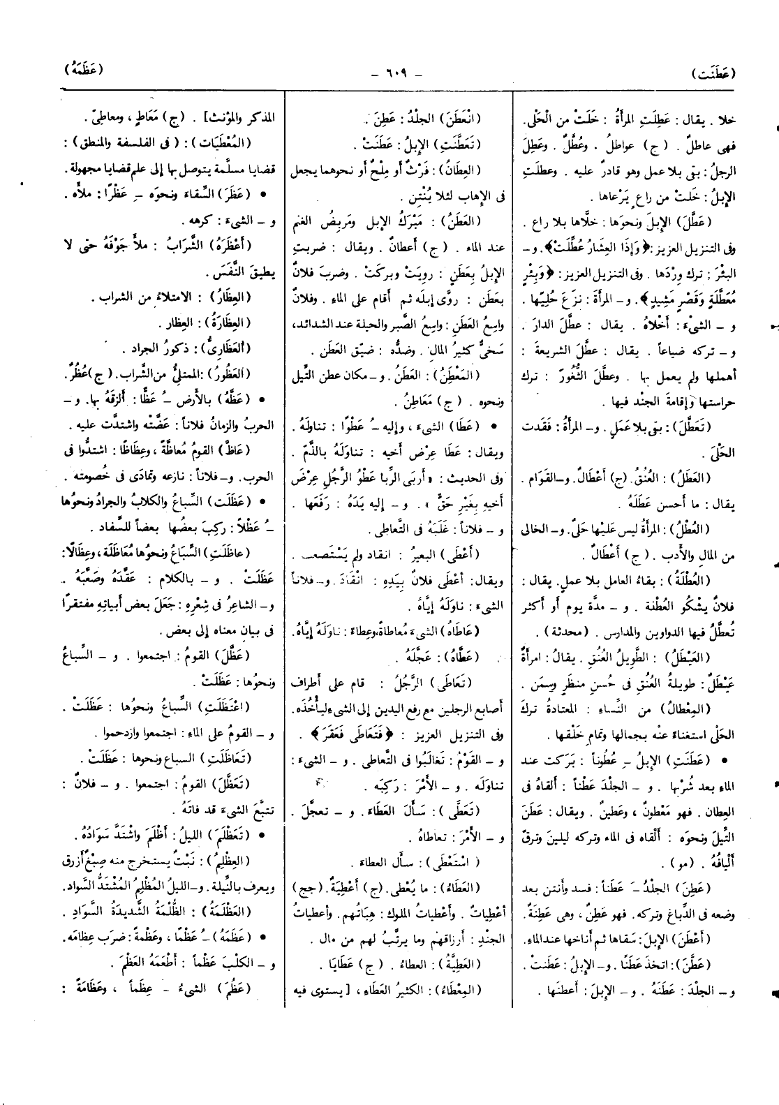 (عطل) الْإِبِل وَنَحْوهَا خَلاهَا بِلَا رَاع وَفِي التَّنْزِيل الْعَزِيز {وَإِذا العشار عطلت} والبئر ترك وردهَا وَفِي التَّنْزِيل الْعَزِيز {وبئر معطلة وَقصر مشيد} وَالْمَرْأَة نزع حليها وَالشَّيْء أخلاه يُقَال عطل الدَّار وَتَركه ضيَاعًا يُقَال عطل الشَّرِيعَة أهملها وَلم يعْمل بهَا وعطل الثغور ترك حراستها وَإِقَامَة الْجند فِيهَا