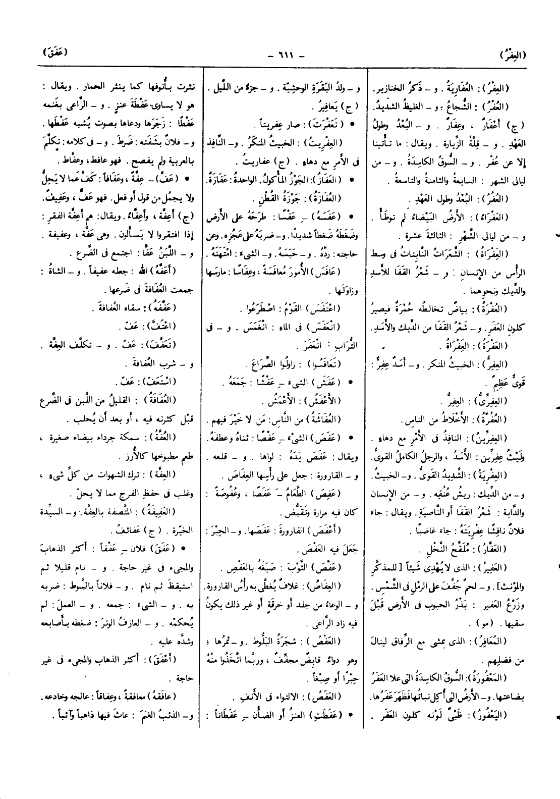 (العفر) الشجاع والغليظ الشَّديد (ج) أعفار وعفار والبعد وَطول الْعَهْد وَقلة الزِّيَارَة وَيُقَال مَا تَأْتِينَا إِلَّا عَن عفر والسوق الكاسدة وَمن ليَالِي الشَّهْر السَّابِعَة وَالثَّامِنَة والتاسعة