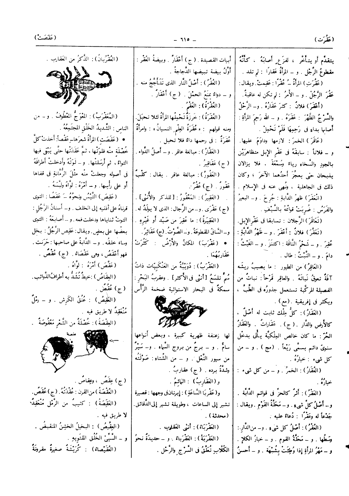 (الْعَقْرَب) دويبة من العنكبيات ذَات سم تلسع (أُنْثَى فِي الْأَكْثَر) وعقرب الْبَحْر سَمَكَة فِي الْبحار الاستوائية ضخمة الرَّأْس لَهَا زعنفة ظهرية كَبِيرَة وَبَعض أَنْوَاعهَا سَام وبرج من بروج السَّمَاء وسير من سيور النَّعْل وَمن الشتَاء صولته وَشدَّة برده (ج) عقارب