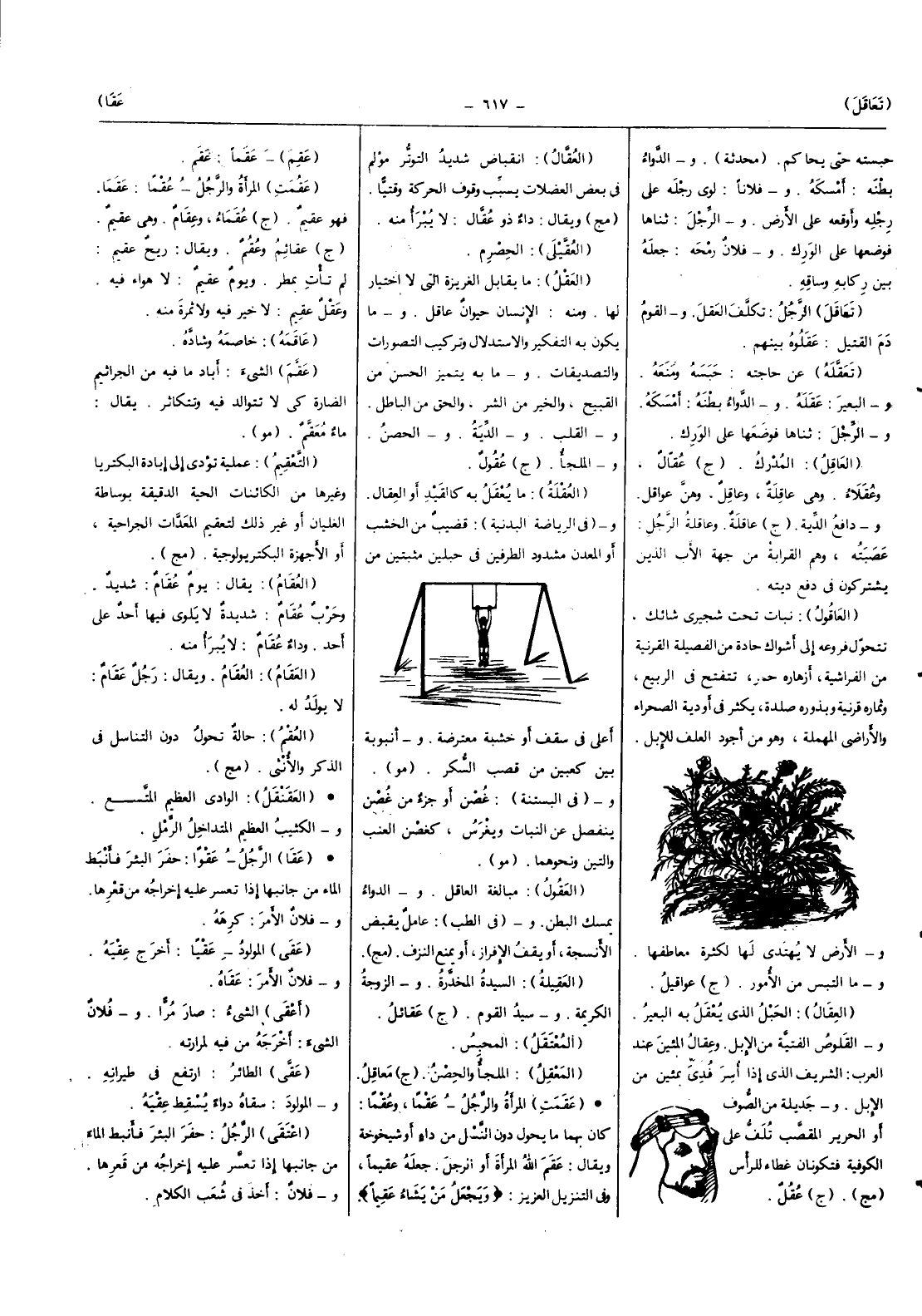 (الْعَاقِل) الْمدْرك (ج) عقال وعقلاء وَهِي عَاقِلَة وعاقل وَهن عواقل ودافع الدِّيَة (ج) عَاقِلَة وعاقلة الرجل عصبته وهم الْقَرَابَة من جِهَة الْأَب الَّذين يشتركون فِي دفع دِيَته