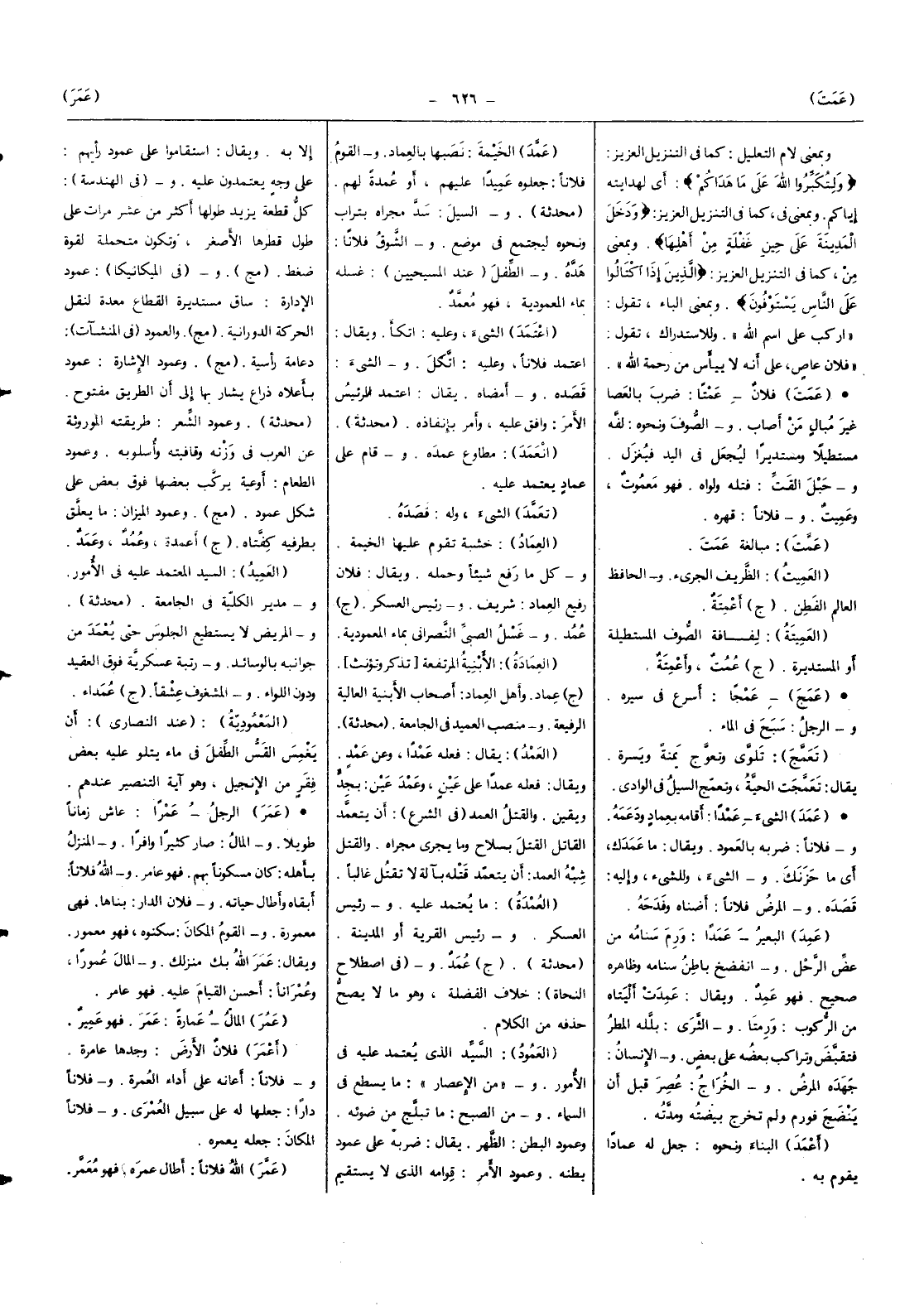 (العمود) السَّيِّد الَّذِي يعْتَمد عَلَيْهِ فِي الْأُمُور و (من الإعصار) مَا يسطع فِي السَّمَاء وَمن الصُّبْح مَا تبلج من ضوئه وعمود الْبَطن الظّهْر يُقَال ضربه على عَمُود بَطْنه وعمود الْأَمر قوامه الَّذِي لَا يَسْتَقِيم إِلَّا بِهِ وَيُقَال استقاموا على عَمُود رَأْيهمْ على وَجه يعتمدون عَلَيْهِ و (فِي الهندسة) كل قِطْعَة يزِيد طولهَا أَكثر من عشر مَرَّات على طول قطرها الْأَصْغَر وَتَكون متحملة لقُوَّة ضغط (مج) و (فِي الميكانيكا) عَمُود الإدارة سَاق مستديرة القطاع معدة لنقل الْحَرَكَة الدورانية (مج) والعمود (فِي الْمُنْشَآت) دعامة رأسية (مج) وعمود الْإِشَارَة عَمُود بأعلاه ذِرَاع يشار بهَا إِلَى أَن الطَّرِيق مَفْتُوح (محدثة) وعمود الشّعْر طَرِيقَته الموروثة عَن الْعَرَب فِي وَزنه وقافيته وأسلوبه وعمود الطَّعَام أوعية يركب بَعْضهَا فَوق بعض على شكل عَمُود (مج) وعمود الْمِيزَان مَا يعلق بطرفيه كفتاه (ج) أعمدة وَعمد وَعمد