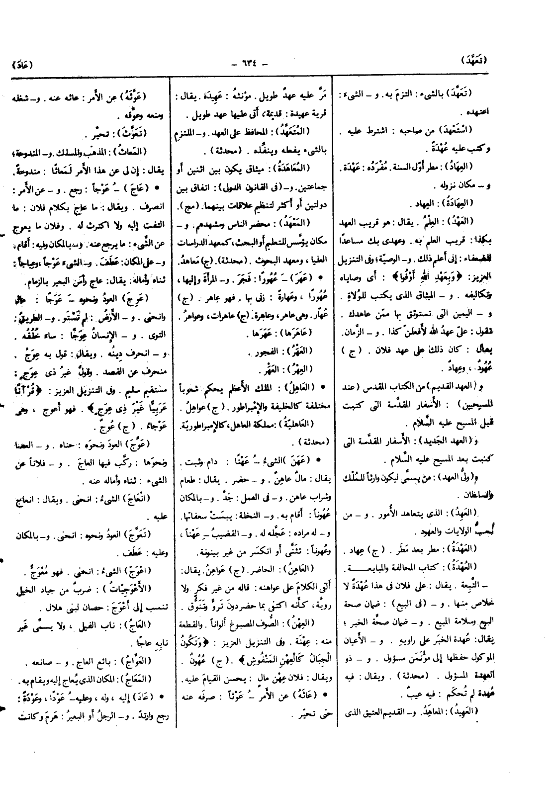 (الْعَهْد) الْعلم يُقَال هُوَ قريب الْعَهْد بِكَذَا قريب الْعلم بِهِ وعهدي بك مساعدا للضعفاء إِنِّي أعلم ذَلِك وَالْوَصِيَّة وَفِي التَّنْزِيل الْعَزِيز {وبعهد الله أَوْفوا} أَي وَصَايَاهُ وتكاليفه والميثاق الَّذِي يكْتب للولاة وَالْيَمِين الَّتِي تستوثق بهَا مِمَّن عاهدك تَقول عَليّ عهد الله لَأَفْعَلَنَّ كَذَا وَالزَّمَان يُقَال كَانَ ذَلِك على عهد فلَان (ج) عهود وعهاد