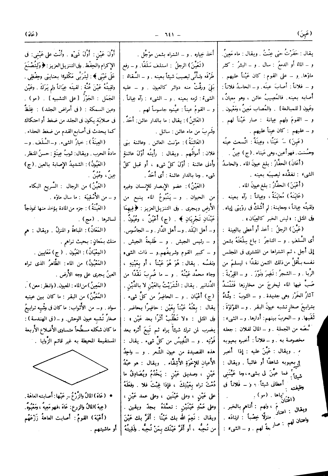 (الْمعِين) من الْبَقر مَا كَانَ بَين عَيْنَيْهِ سَواد وَمن الأثواب مَا كَانَ فِي وشيه ترابيع صغَار تشبه عُيُون الْوَحْش و (فِي الهندسة) مَا كَانَ شكله مسطحًا متساوي الأضلاع الْأَرْبَعَة المستقيمة المحيطة بِهِ غير قَائِم الزوايا