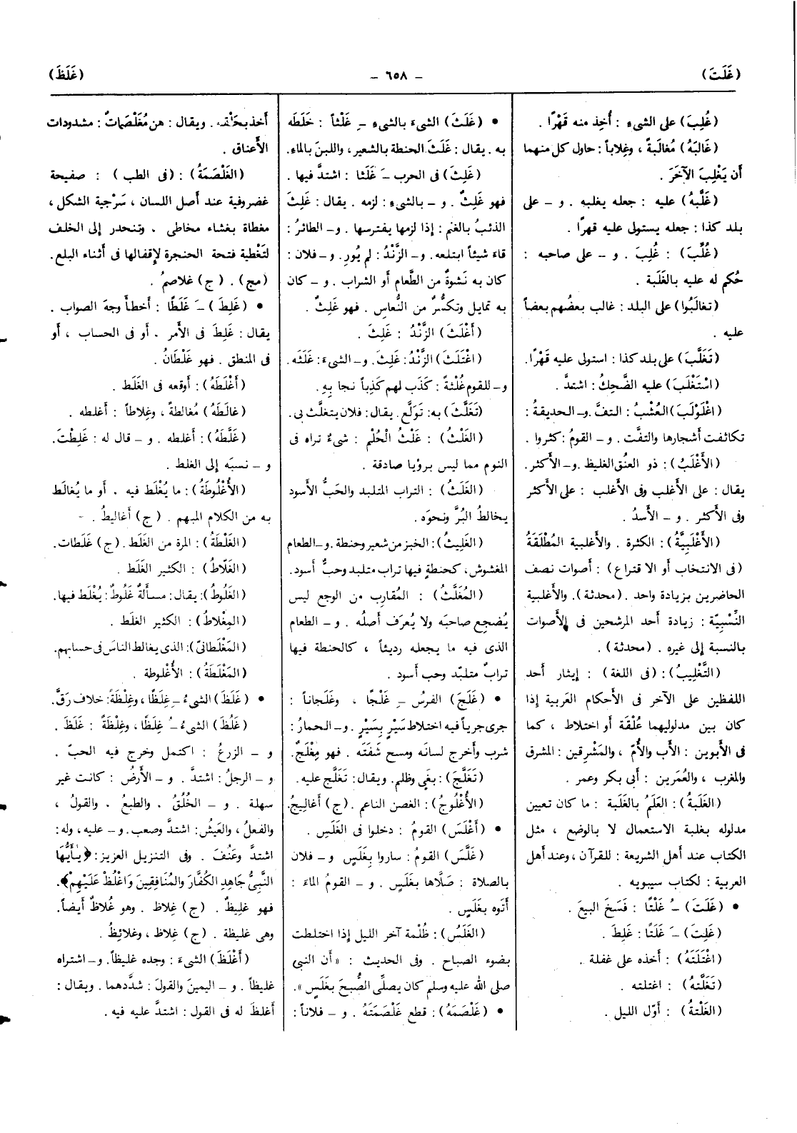 (غلظ) الشَّيْء غلظا وغلظة غلظ وَالزَّرْع اكتمل وَخرج فِيهِ الْحبّ وَالرجل اشْتَدَّ وَالْأَرْض كَانَت غير سهلة والخلق والطبع وَالْقَوْل وَالْفِعْل والعيش اشْتَدَّ وصعب وَعَلِيهِ وَله اشْتَدَّ وعنف وَفِي التَّنْزِيل الْعَزِيز {يَا أَيهَا النَّبِي جَاهد الْكفَّار وَالْمُنَافِقِينَ وَاغْلُظْ عَلَيْهِم} فَهُوَ غليظ (ج) غِلَاظ وَهُوَ غِلَاظ أَيْضا وَهِي غَلِيظَة (ج) غِلَاظ وغلائظ