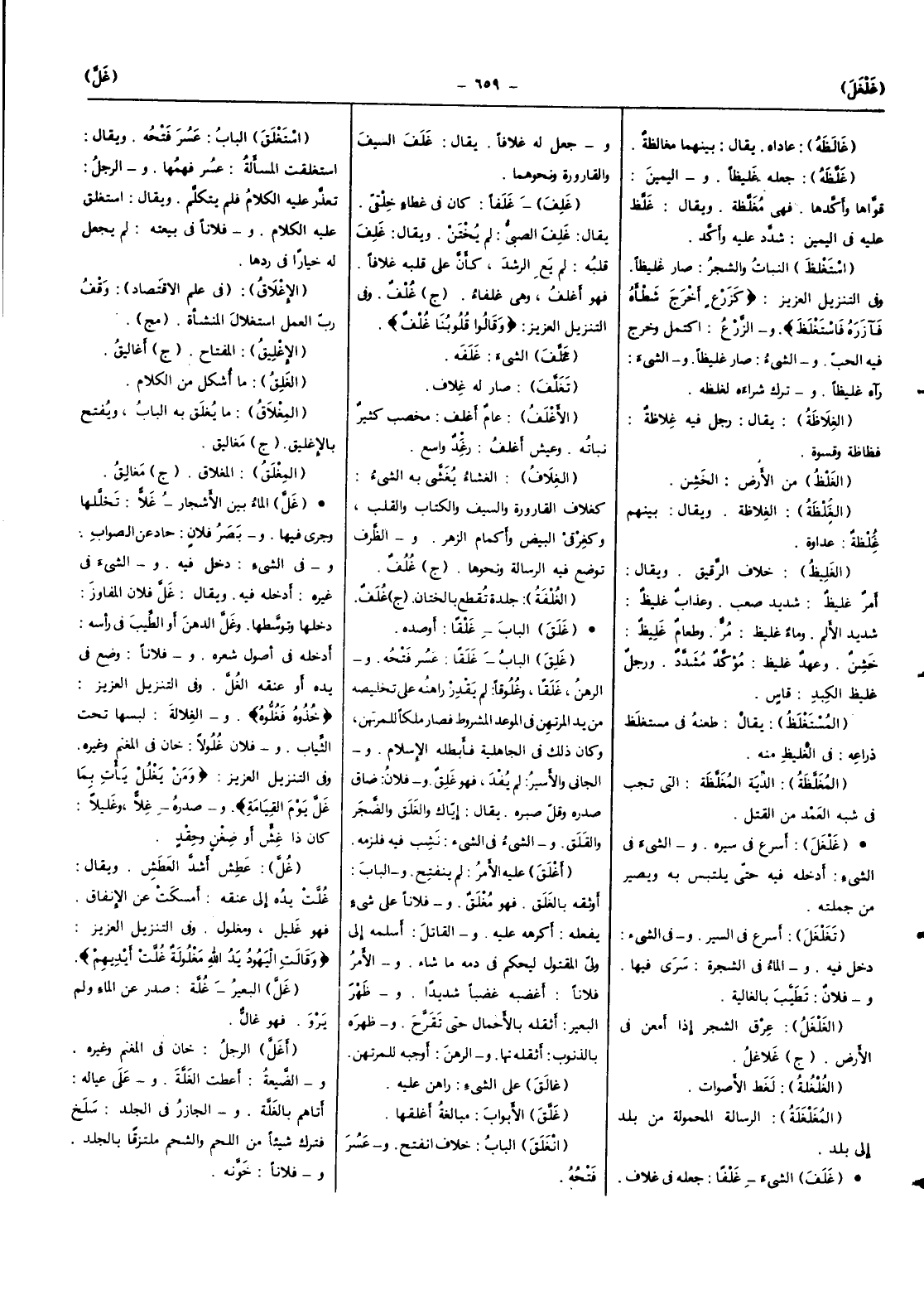 (الغليظ) خلاف الرَّقِيق وَيُقَال أَمر غليظ شَدِيد صَعب وَعَذَاب غليظ شَدِيد الْأَلَم وَمَاء غليظ مر وَطَعَام غليظ خشن وعهد غليظ مُؤَكد مشدد وَرجل غليظ الكبد قَاس