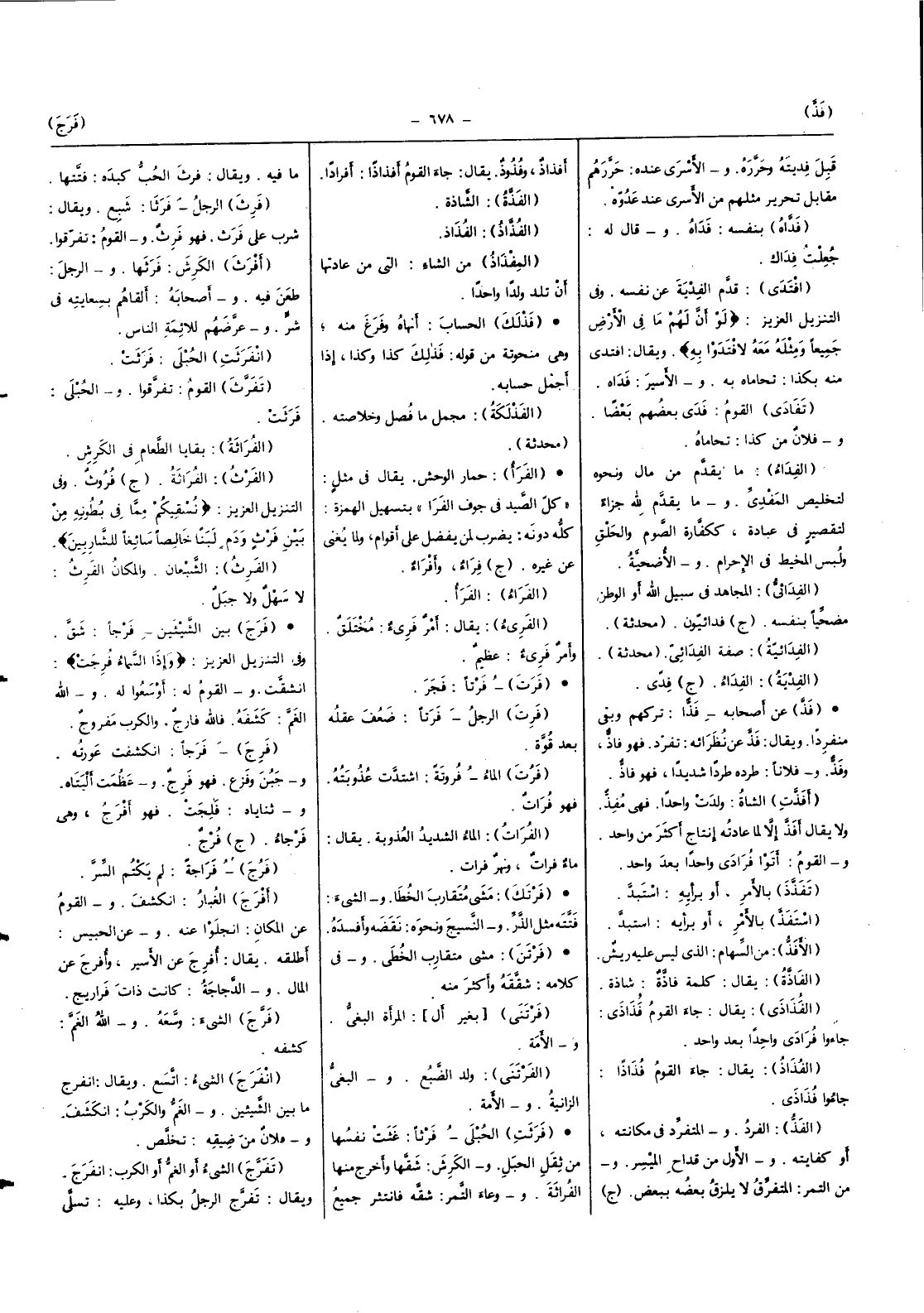 من أَصْحَابه فَذا تَركهم وَبَقِي مُنْفَردا وَيُقَال فذ عَن نظرائه تفرد فَهُوَ فاذ وفذ وَفُلَانًا طرده طردا شَدِيدا فَهُوَ فاذ