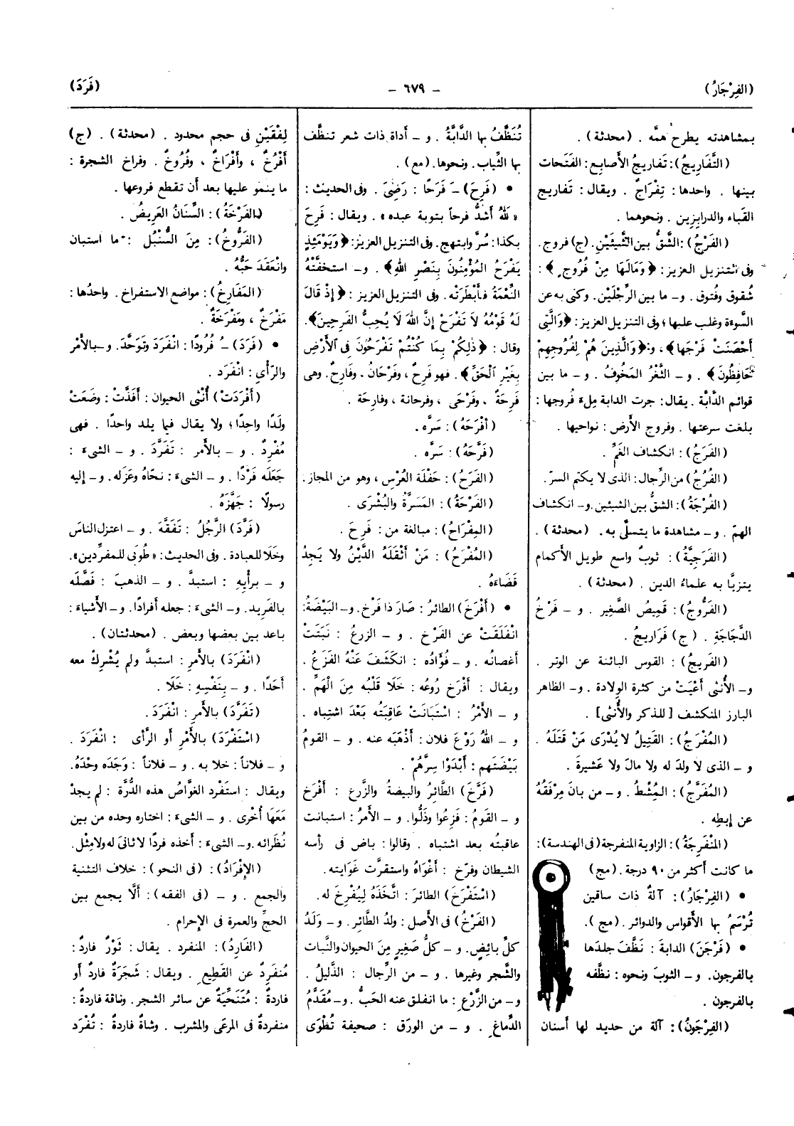 (فَرد) الرجل تفقه وَاعْتَزل النَّاس وخلا لِلْعِبَادَةِ وَفِي الحَدِيث (طُوبَى للمفردين) وبرأيه استبد وَالذَّهَب فَصله بالفريد وَالشَّيْء جعله أفرادا والأشياء باعد بَين بَعْضهَا وَبَعض (محدثتان)