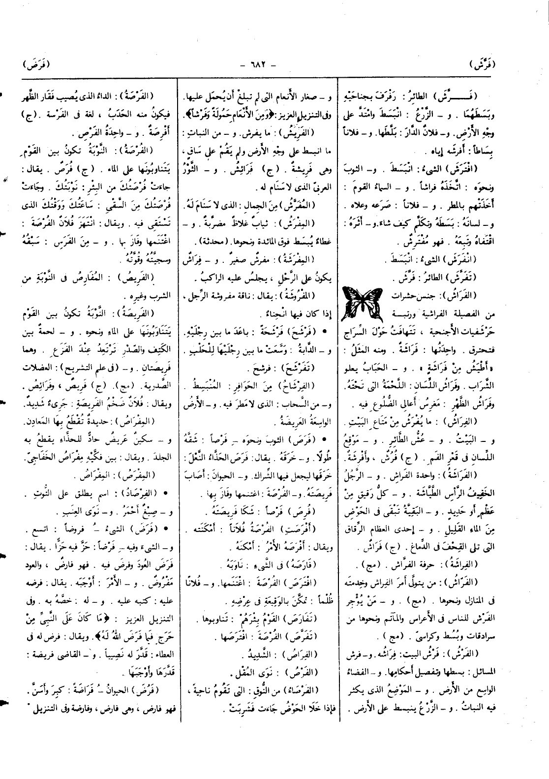 (الفراشة) وَاحِدَة الْفراش وَالرجل الْخَفِيف الرَّأْس الطياشة وكل رَقِيق من عظم أَو حَدِيد والبقية تبقى فِي الْحَوْض من المَاء الْقَلِيل وَإِحْدَى الْعِظَام الرقَاق الَّتِي تلِي القحف فِي الدِّمَاغ (ج) فرَاش