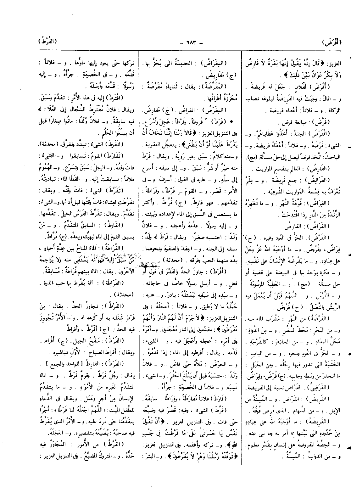 (فرط) الشَّيْء وَفِيه قصر فِيهِ وضيعه حَتَّى فَاتَ وَفِي التَّنْزِيل الْعَزِيز {أَن تَقول نفس يَا حسرتى على مَا فرطت فِي جنب الله} وَتَركه وأغفله وَفِي التَّنْزِيل الْعَزِيز {توفته رسلنَا وهم لَا يفرطون} والبئر تَركهَا حَتَّى يعود إِلَيْهَا مَاؤُهَا وَفُلَانًا قدمه وَفِي الْخُصُومَة جرأه وَإِلَيْهِ رَسُولا قدمه وأرسله