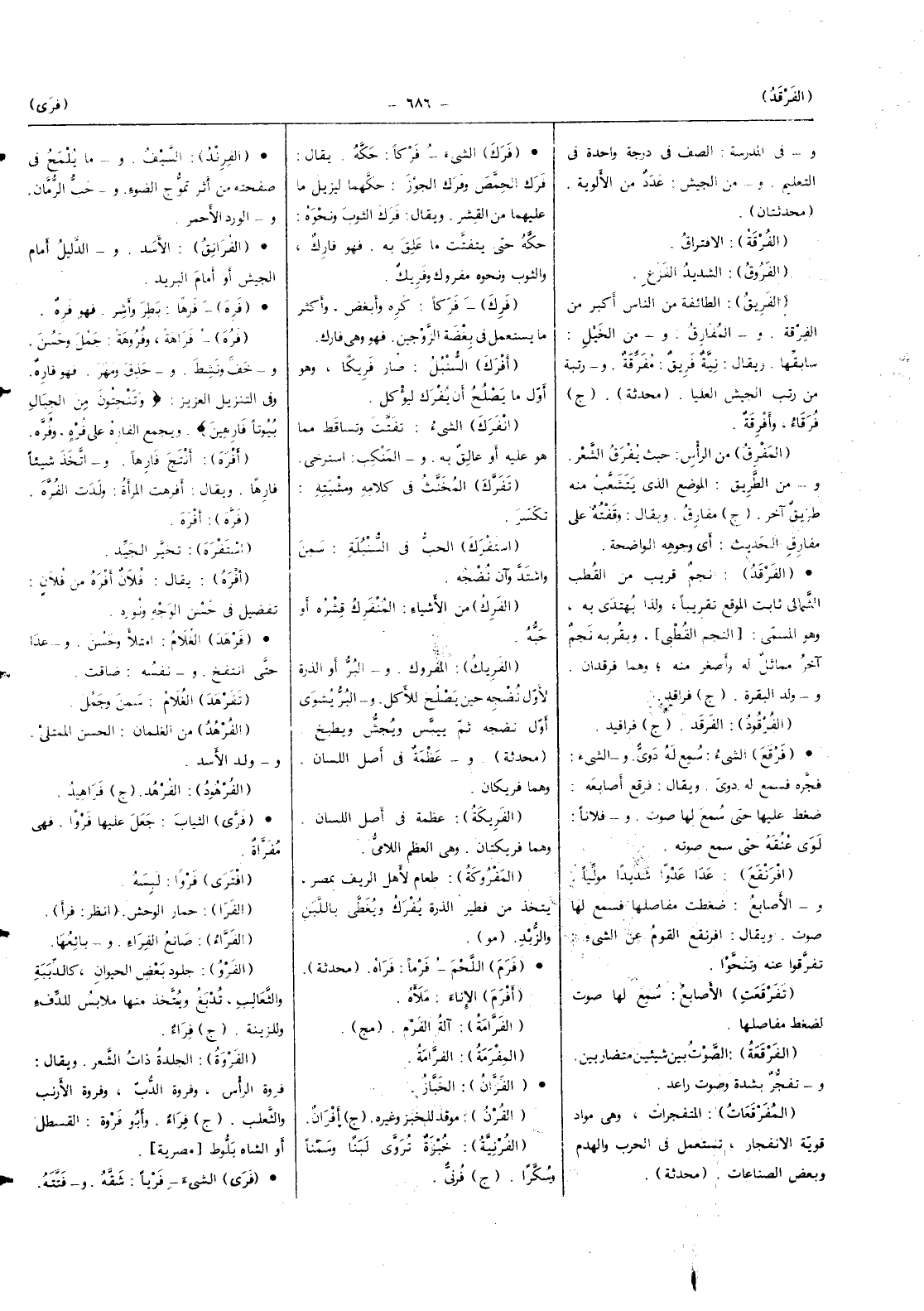 (الْفَرِيق) الطَّائِفَة من النَّاس أكبر من الْفرْقَة والمفارق وَمن الْخَيل سابقها وَيُقَال نِيَّة فريق مفرقة ورتبة من رتب الْجَيْش الْعليا (محدثة) (ج) فرقاء وأفرقة
