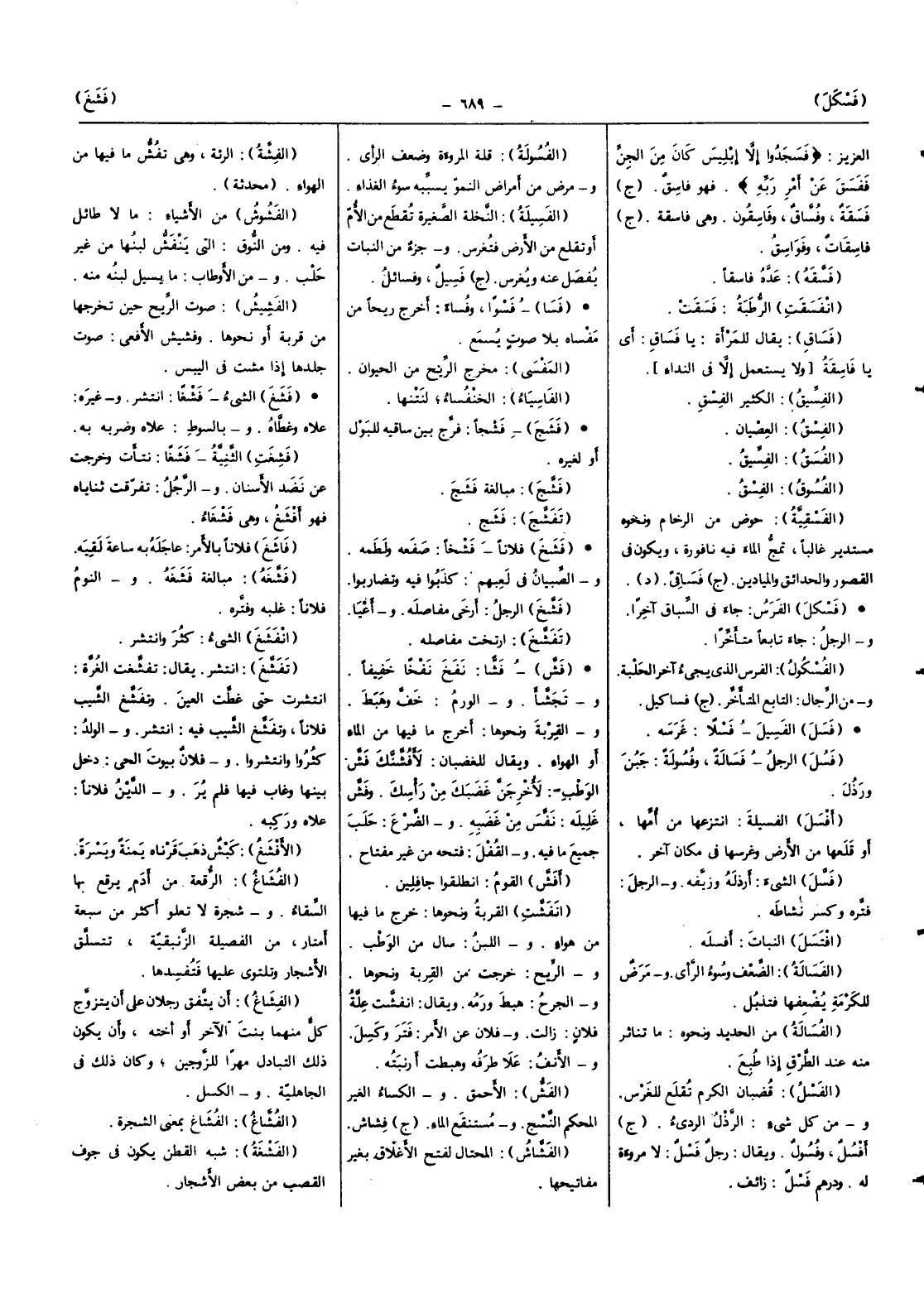 الْعَزِيز {فسجدوا إِلَّا إِبْلِيس كَانَ من الْجِنّ ففسق عَن أَمر ربه} فَهُوَ فَاسق (ج) فسقة وفساق وفاسقون وَهِي فاسقة (ج) فاسقات وفواسق