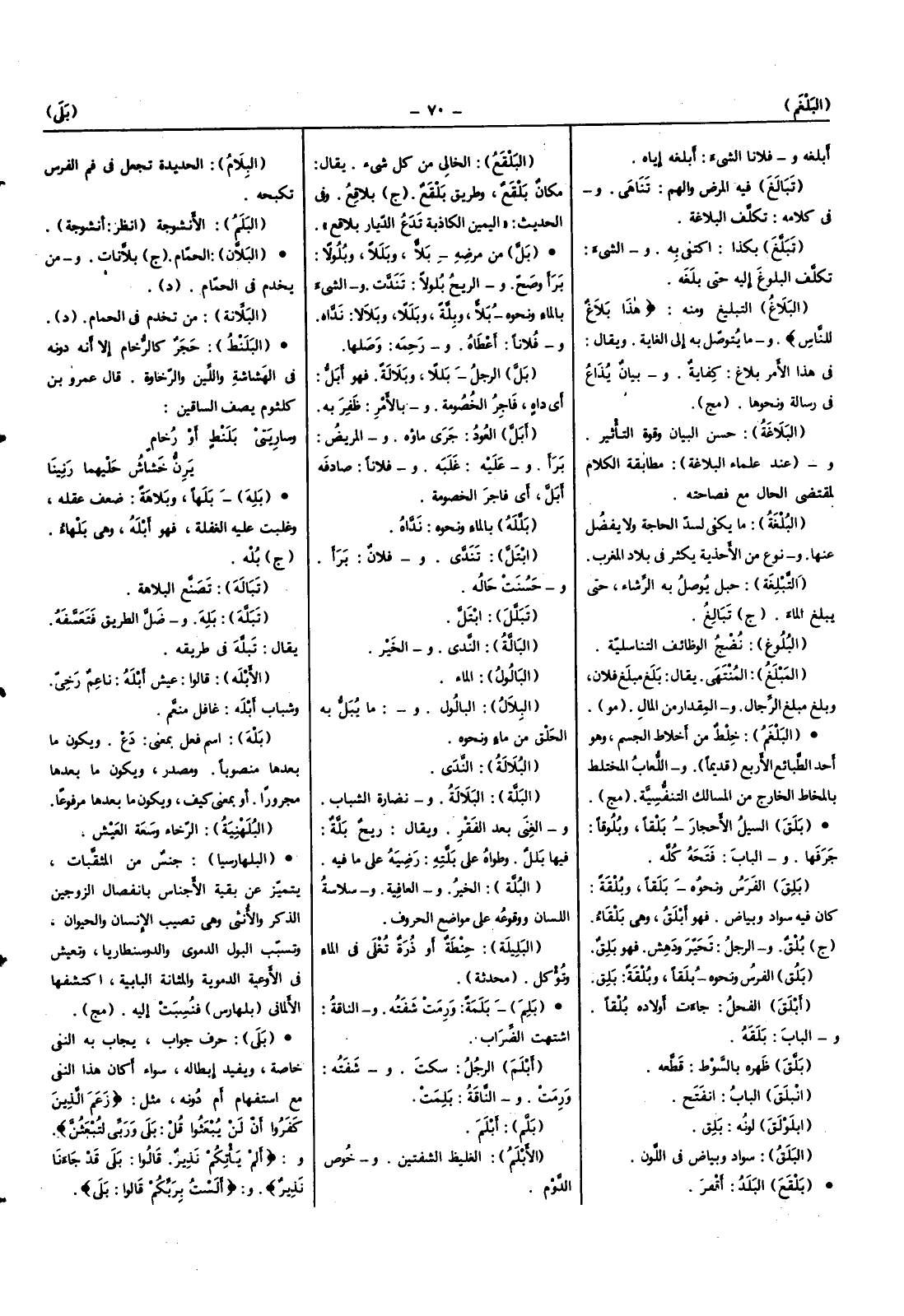 من مَرضه بِلَا وبللا وبلولا برأَ وَصَحَّ وَالرِّيح بلولا تندت وَالشَّيْء بِالْمَاءِ وَنَحْوه بِلَا وبلة وبللا وبلالا نداه وَفُلَانًا أعطَاهُ ورحمه وَصلهَا